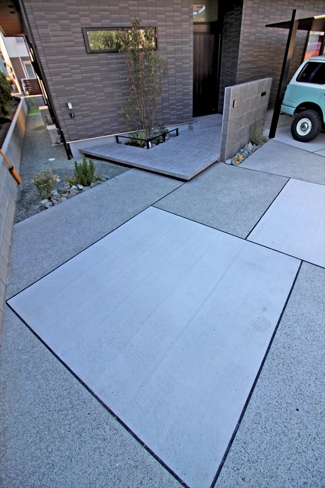 モダンな建物に寄り添うシックなオープン外構です。目隠しを兼ねた重厚感のある門柱や、施主様が希望された『LIXIL:カーポートSC』が、真新しい建物に調和します。前面道路が狭いため敷地内の動線を考慮して玄関廻りをデザイン。玄関ポーチを広く造成することでゆとりあるファサードを実現しました 。