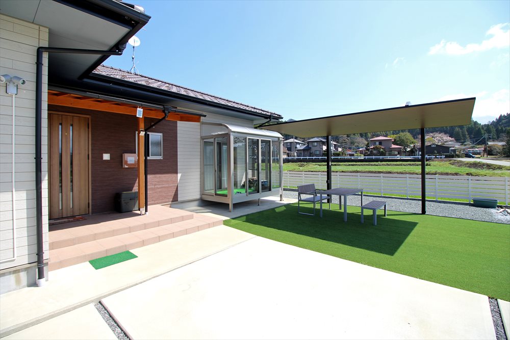 リビング前のお庭スペースに人工芝を敷き、テラス屋根を設置しました。選ばれたのは『LIXIL:テラスSC』です。木調色の屋根が柔らかな雰囲気を演出し、心地よい影を作ります。人工芝の艶めく緑とのコントラストが美しいお庭が完成しました。