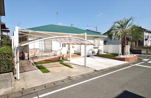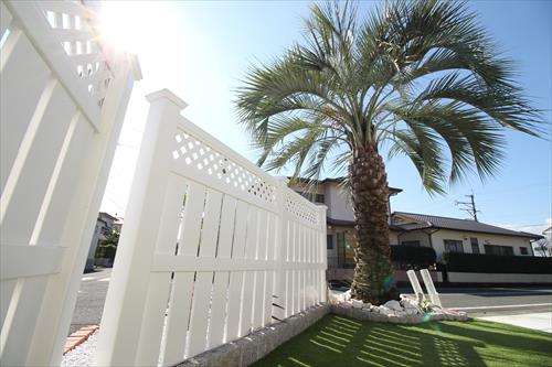 大きなヤシの木をシンボルに、建物の雰囲気に合った外構リフォームを行ないました。敷地を覆い隠していた樹木を撤去し、目隠しに選ばれたのはバイナルフェンス。しっかり目隠してくれる真っ白いフェンスが素敵です。車庫スペースも拡張し、お洗濯干し場には屋根を、玄関脇にはスロープを。使い勝手を追求し、デザイン性も重視した、爽やかな風が似合うエクステリアです。