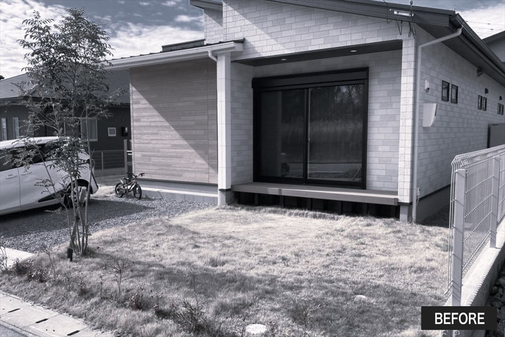 天然芝のお庭は遮るものが何も無く、通りの視線が気になってリビングのカーテンを開けることができなかったことから、ウォールでしっかりと囲ったプライベート空間をご提案しました。モノトーンのウォールに格子材を合わせることで透け感をプラスし、圧迫感を軽減しています。ベンチを設けることでご家族の憩いの場となり、お庭で過ごす時間が増えたそうです。
