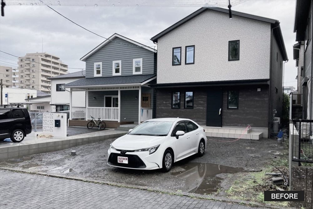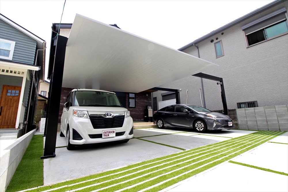 事務所兼用の住宅に、お仕事関係の来客を考慮した広い広い駐車スペースをご提案しました。カーポートは施主様ご希望の『カーポートSC』を設置。玄関の軒に屋根がかかるようにカーポートを配する事で雨の日も濡れずに行き来できます。土間には人工芝のボーダーラインを入れ、シンプルな車庫スペースにアクセントを加えました。