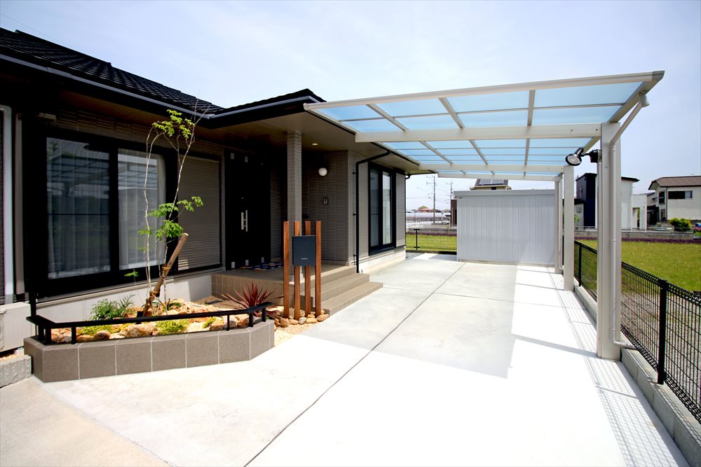 道路と宅地に高低差のある施主様邸は、勾配のあるスロープを経て玄関前が駐車スペースとなっています。一面をコンクリートで仕上げていたため少し物寂しくもあり、玄関脇の一部を植栽帯として植物やロックアイテムを用いたフォーカルポイントをご提案しました。木調の角柱やシンボルツリーが目隠しの役割も担います。優しい風合いの心地よいファサードが完成しました。