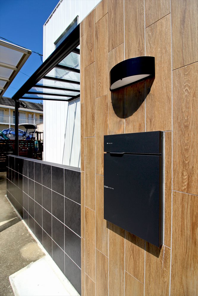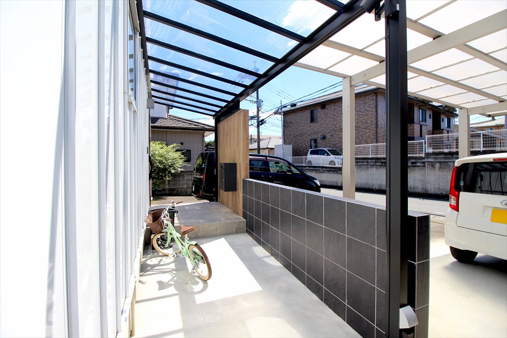 玄関の庇が小さく雨の降り込みにお困りだったY様。お子様の自転車置き場も検討されていたため、大型のテラス屋根『LIXIL:テラスVS』を新設して駐輪スペースを一体化した軒空間をご提案しました。玄関ドアの前には目隠し兼門柱として『四国化成:アートウォール』を採用し、プライベート感を高めています。木目柄がガルバ外壁に調和し、温もりあるファサードへと生まれかわりました。
