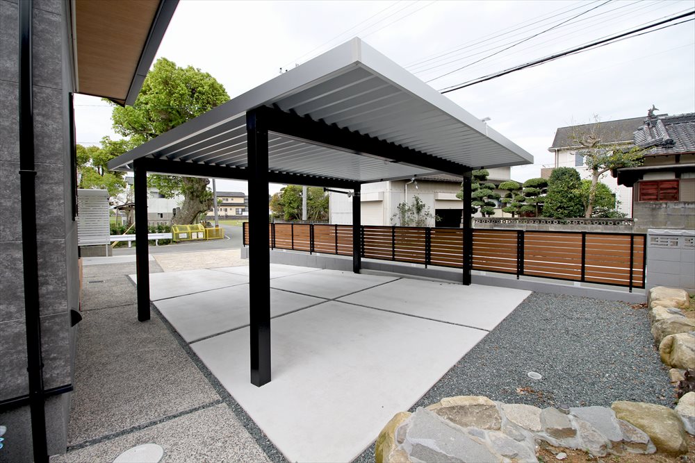 ご実家の敷地内に新築されたS様。『かっこいいカーポート』を希望されたことから、ご自宅横には『LIXIL:カーポートSC』、ご実家の駐車スペースには折半カーポート『三協アルミ:G-1R』をご提案しました。リビング前のウッドデッキに合わせ、門柱や目隠しフェンスに木調色を取り入れることでぬくもりのある温かな雰囲気を演出。進入口の既存のコンクリートには石目調の塗装を施し、華やかさもプラスしました。