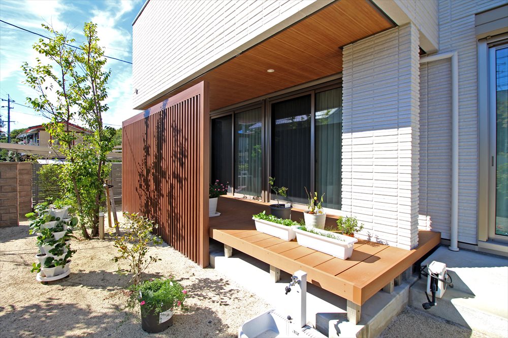 既存のウッドデッキにスクリーンフェンスを設置しました。2.4mの高さを誇り、外からの視線を防ぐ目隠しとして西日を遮る日除けとして、施主様のプライバシーを守ります。すらりと伸びる縦格子がお庭の樹木と調和して、優しく・モダンな雰囲気を演出しています。