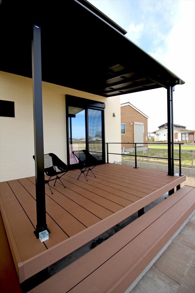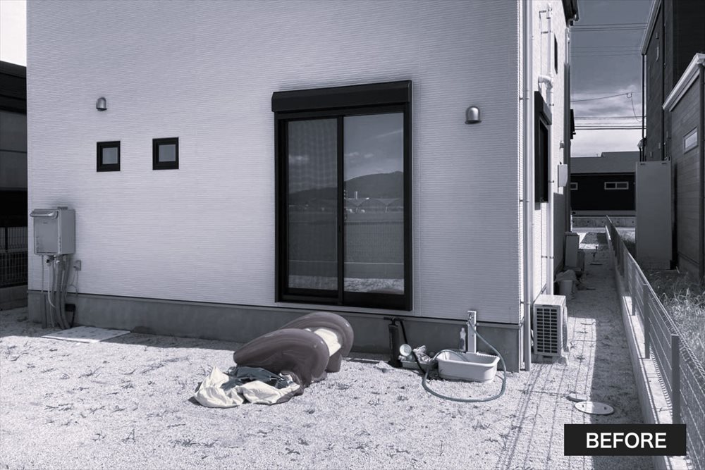 山砂のお庭は雑草のお手入れが大変だったことから、ご家族で楽しめるメンテナンスフリーのお庭を希望されました。リビングの先にはデッキやテラス屋根が広がり、足元は透水性のコンクリート平板は人工芝でカラフルに。小さなお子さんたちが思い切り走り回れる、優しい風合いのお庭が完成しました。