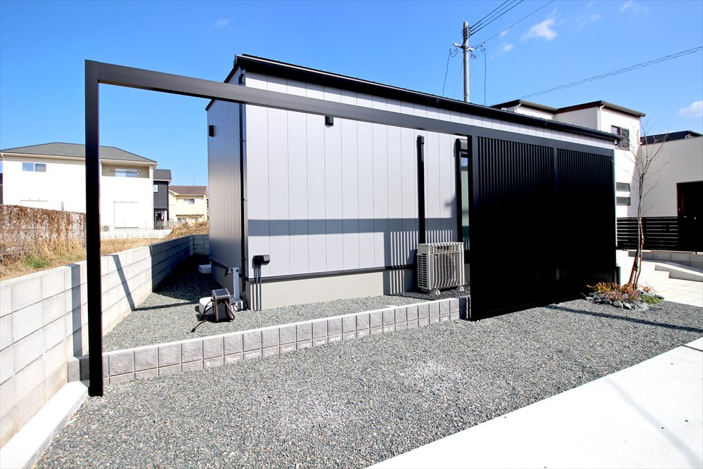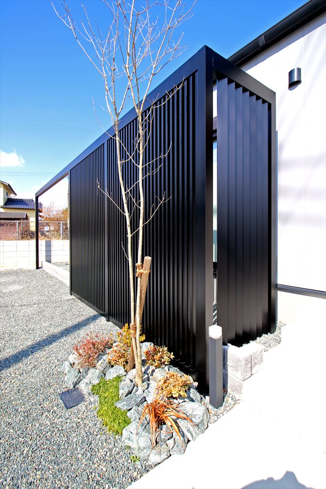 通りからの視線が気になるリビング前に『LIXIL:プラスG』のデザイン格子で目隠しを行いました。スクエアな建物ラインに沿って伸びるフレームで空間を間取り、迫力の”黒”が建物と調和します。