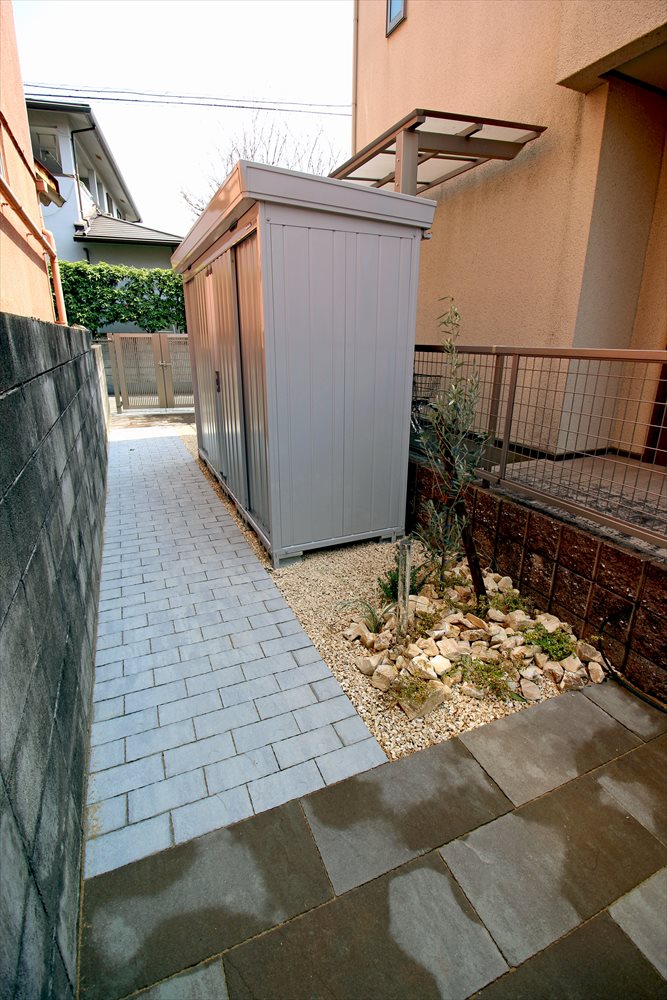 車庫から道路へと続く細い旗竿の通路を駐輪スペースとして活用されていた施主様。もっと使い勝手よくなるようにリフォームされました。足元は透水性の舗装材で整え、サイクルポートや物置を設置。それらはアイストップの役割を担い、外からの視線を遮ります。中央に設けた植栽帯で長く続く通路に癒しの効果を与えました。
