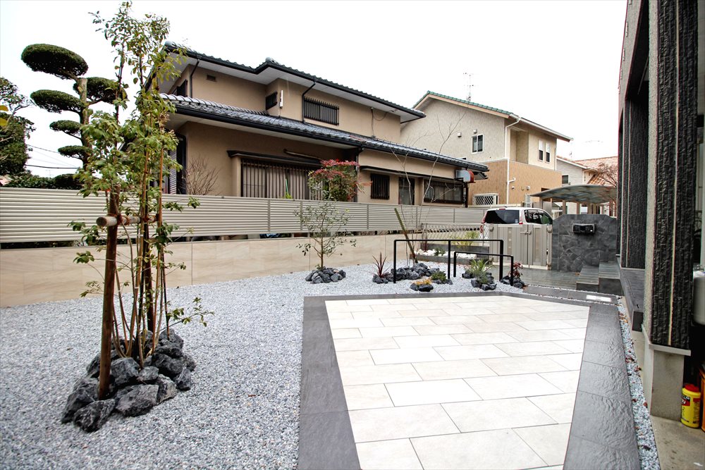 広いお庭の雑草対策としてリフォームを行いました。既存のウッドデッキから広がる2色使いのガーデンフロアにバランスよく配した植栽が調和し、落ち着きのあるシックな雰囲気を演出します。汚れが気になる境界ブロックには『アートボード』を貼り、美しく仕上げました。