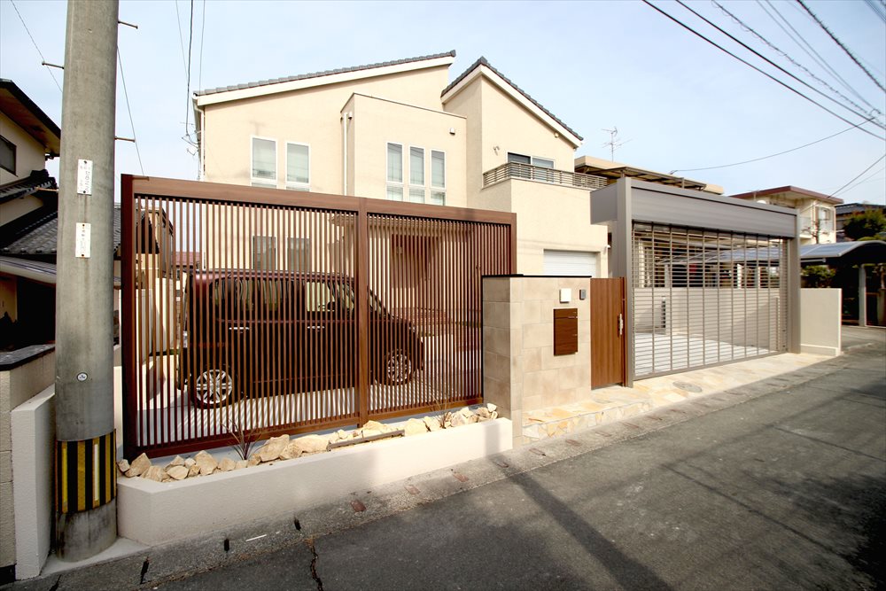 防犯性を重視して、敷地全体を囲うクローズ外構へとリフォームされた施主様。高さのある大判タイルの門柱や縦格子のスクリーンフェンスは木目調で柔らかな雰囲気に…大型門扉やワイドシャッターで道路際をしっかりクローズし、敷地内の解放感を大切にしました。 全体をブラウンやベージュ系で統一し高級感のあるエクステリアとなりました。