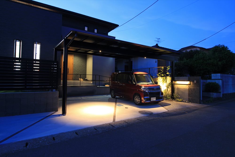 玄関廻りを中心に優しく灯る柔らかな光。カーポートのダウンライト、表札、浮き階段…お客様を誘う効果的な照明計画で、美しい夜の表情を演出しました。