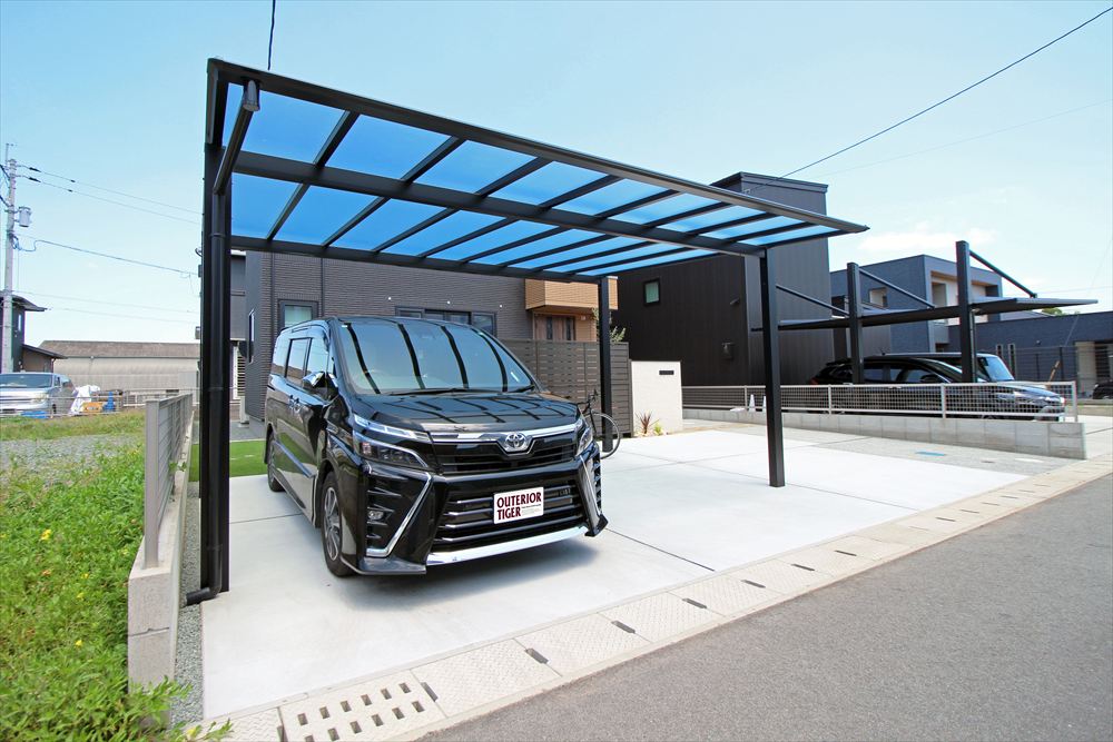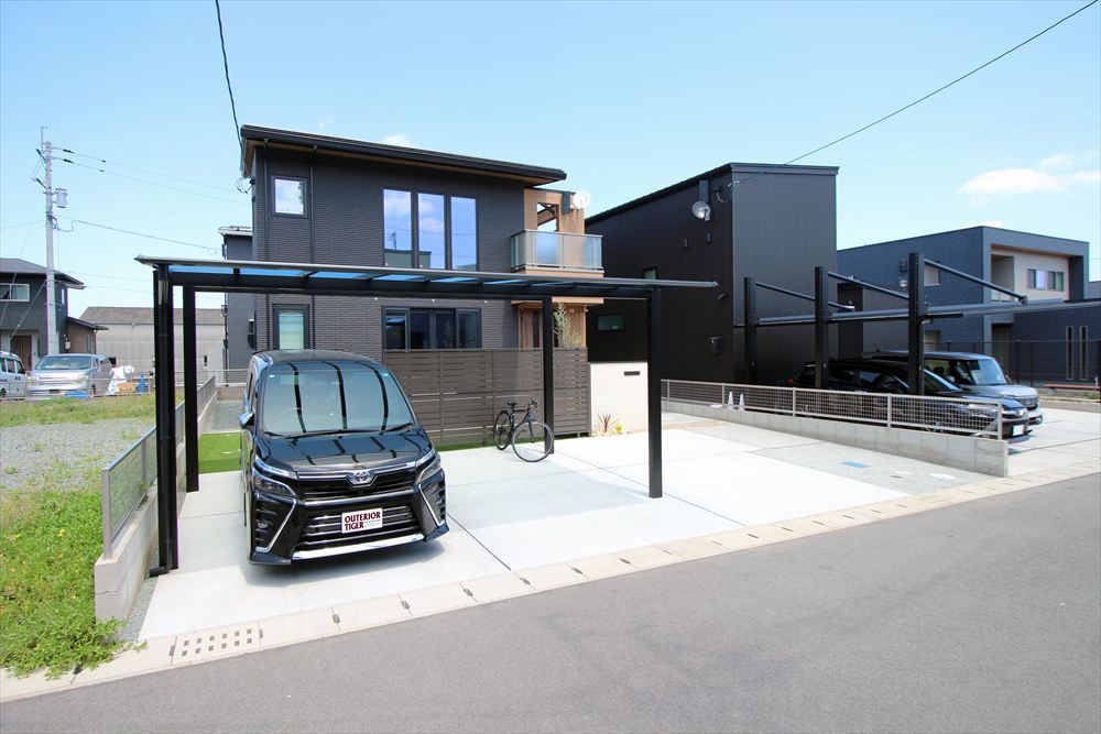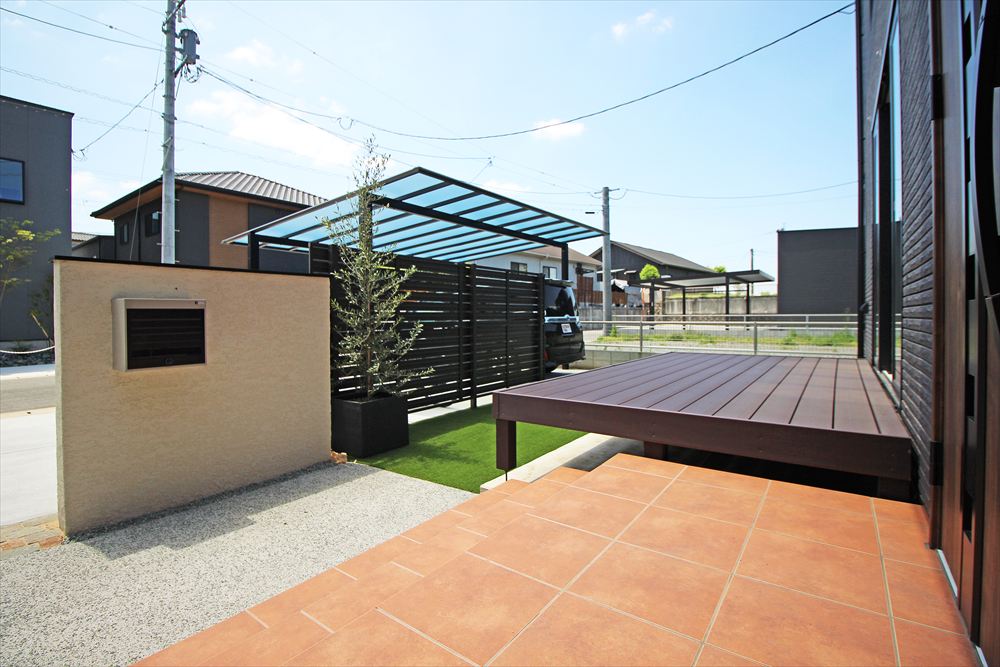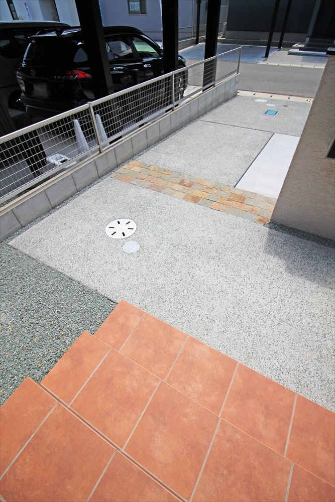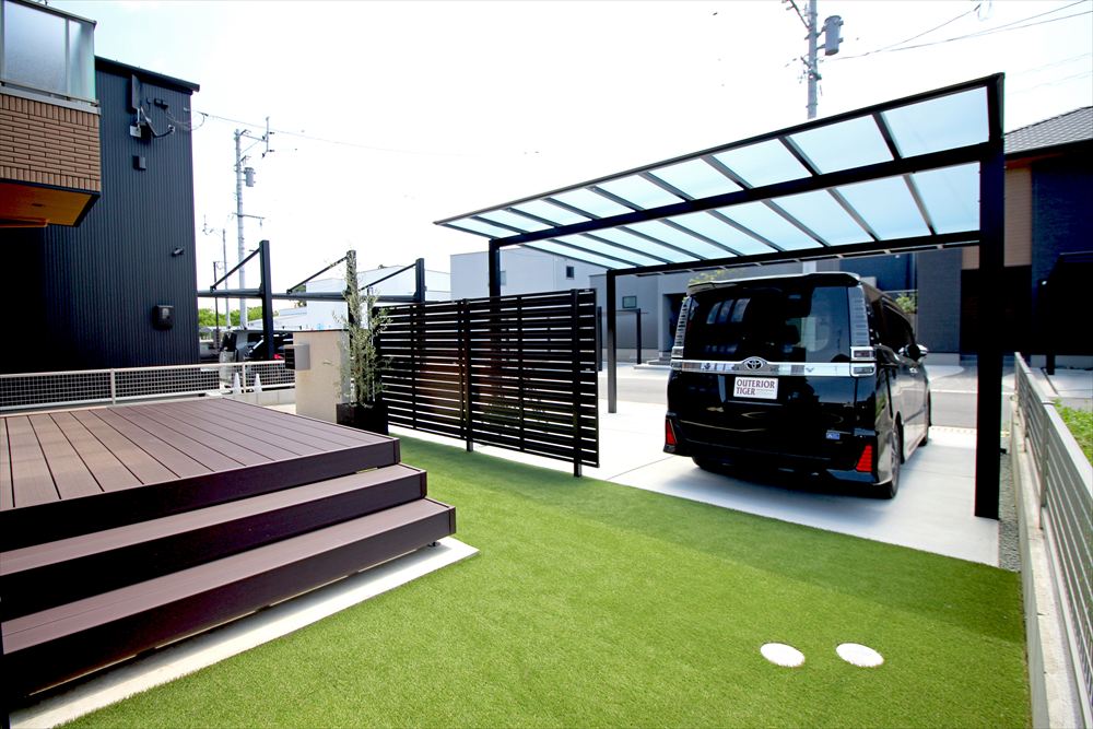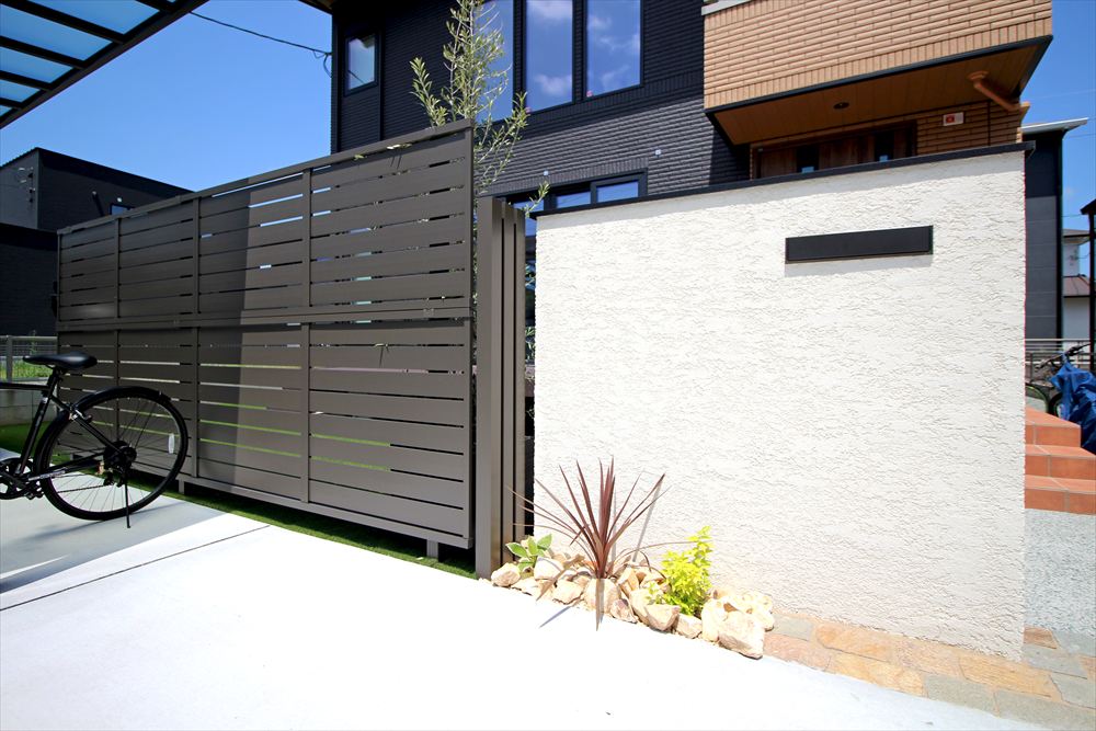 お庭と車庫を仕切るように、門柱に背の高いフェンスを合わせて目隠し効果を高めました。広い車庫スペースが単調にならないよう、アプローチは洗い出しで仕上げアクセントにレンガのラインを入れています。お庭に広がる人工芝の緑が美しく、車庫からお部屋へ行き来しやすくなっています。