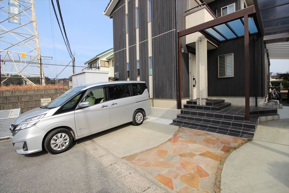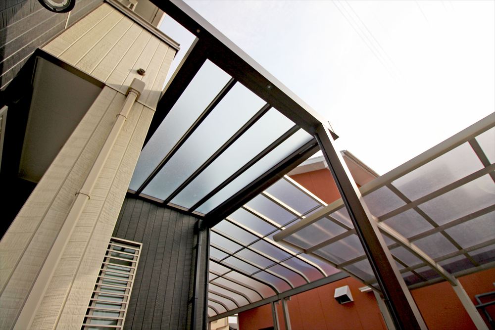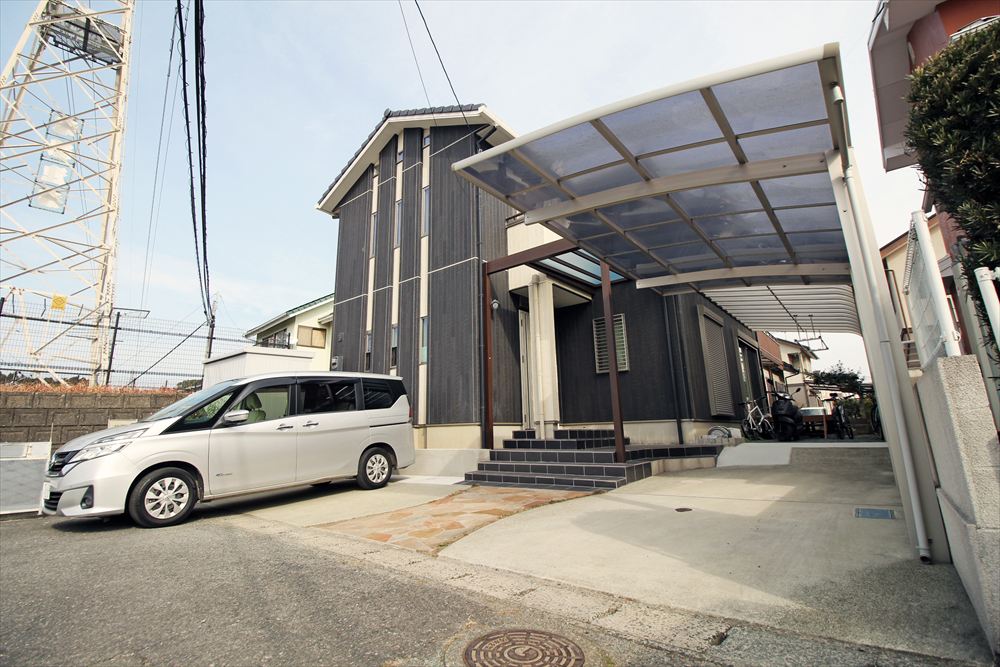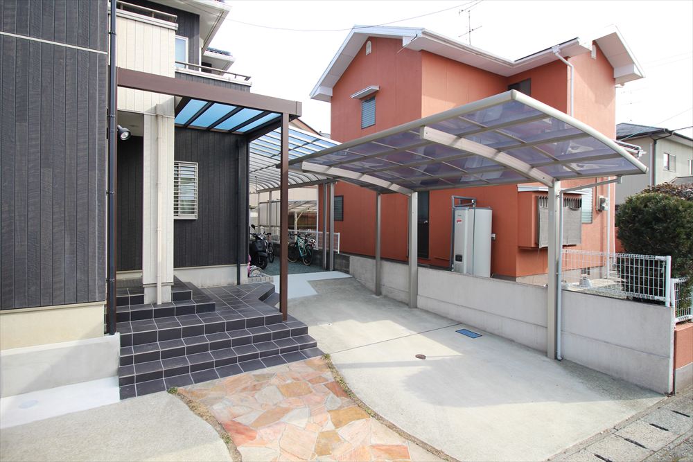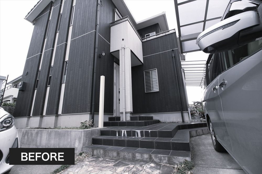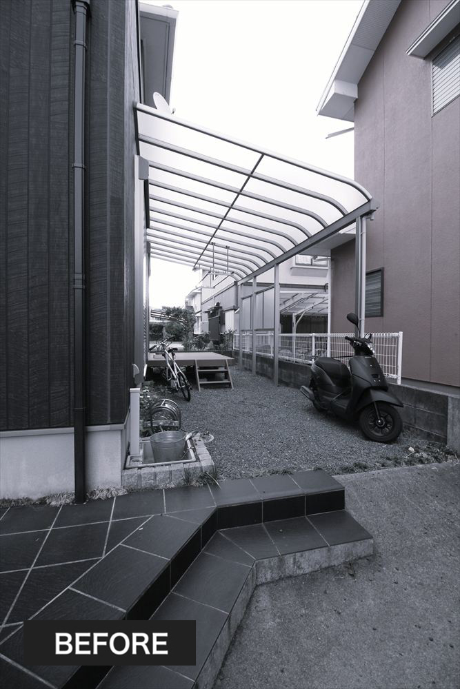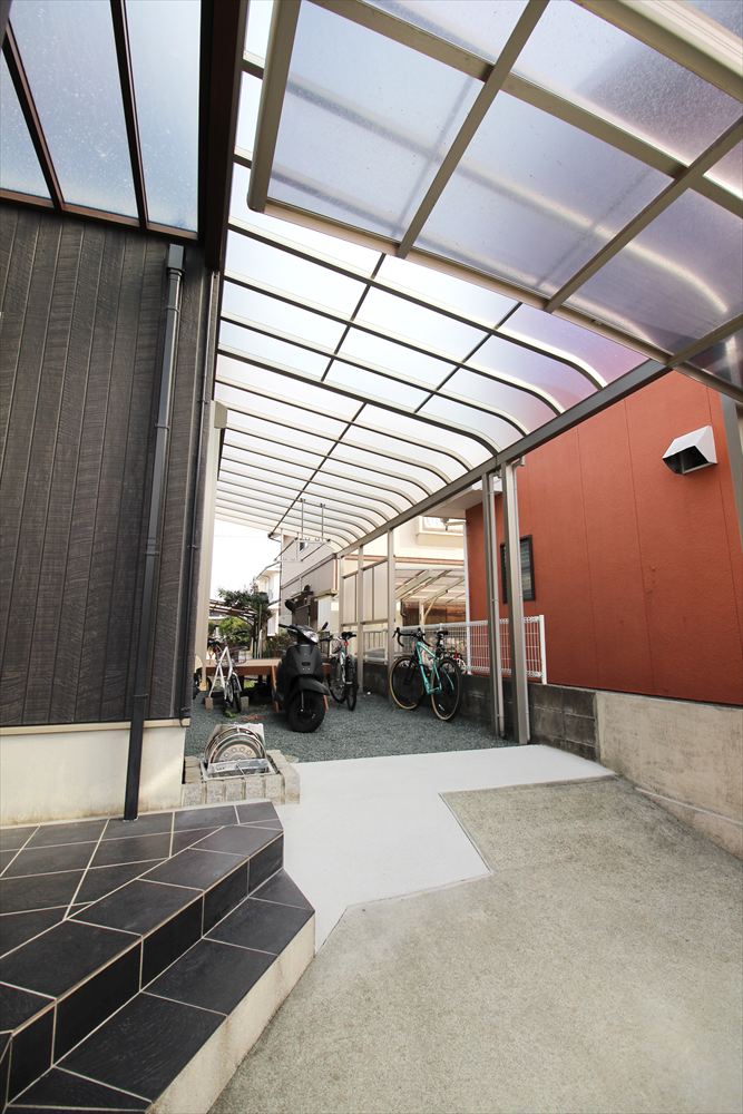 玄関先に屋根がなかったことから、雨を凌ぐためのルーフを新設しました。また、玄関ポーチを一部カットすることでバイクのお庭への侵入がスムーズになり駐輪しやすくなっています。エントランスの機能性を高め、利便性を追求しました。
