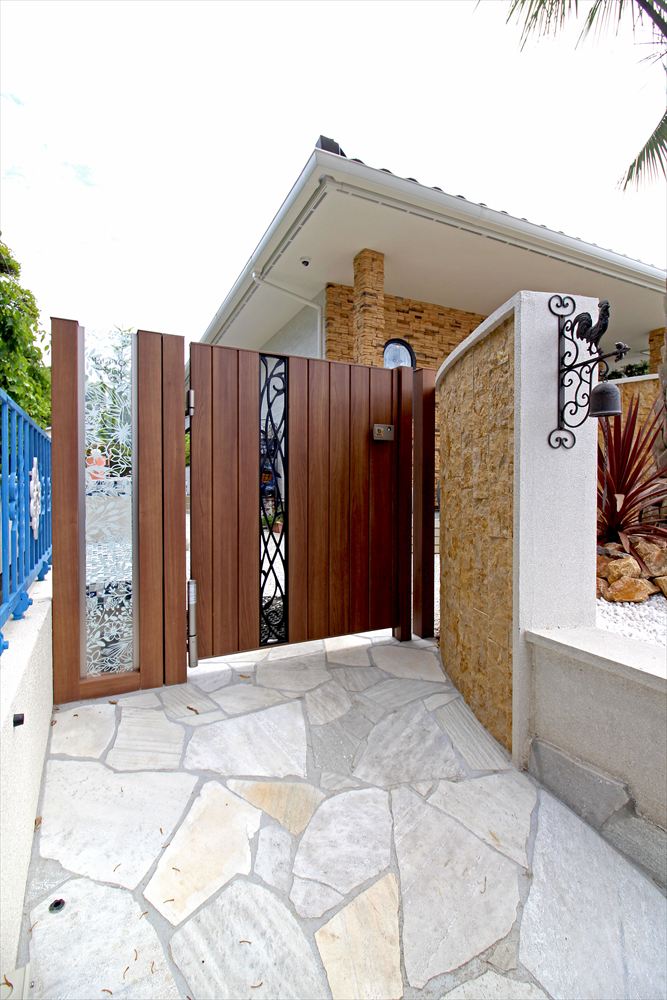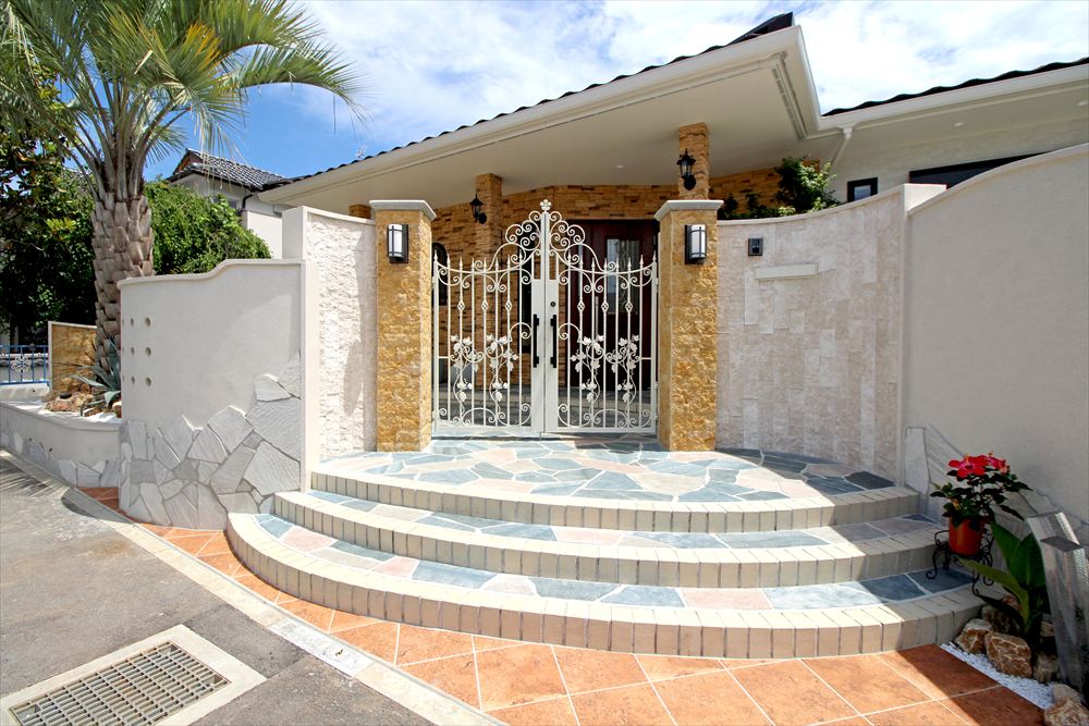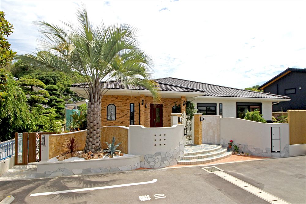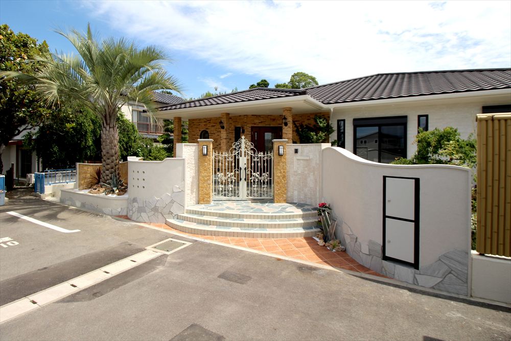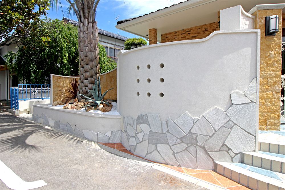 こだわりの建物に調和するクローズ外構をご提案しました。存在感のある重厚な門構え、3次元に波打つウォール、それらを引き立てる様々な素材…圧巻は5mに迫るココスヤシで、施主様が自ら吟味し成長を見守ったシンボルツリーが外構を引き立て、施主様の生活に寄り添います。