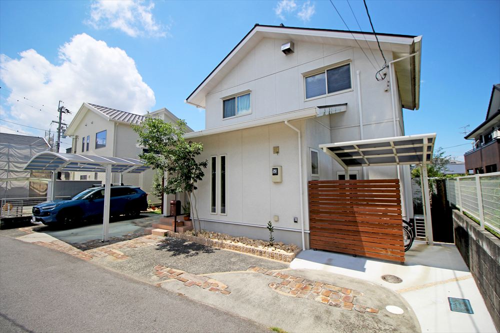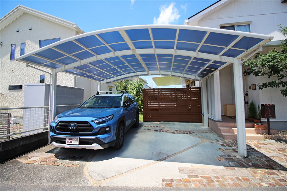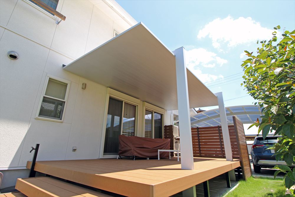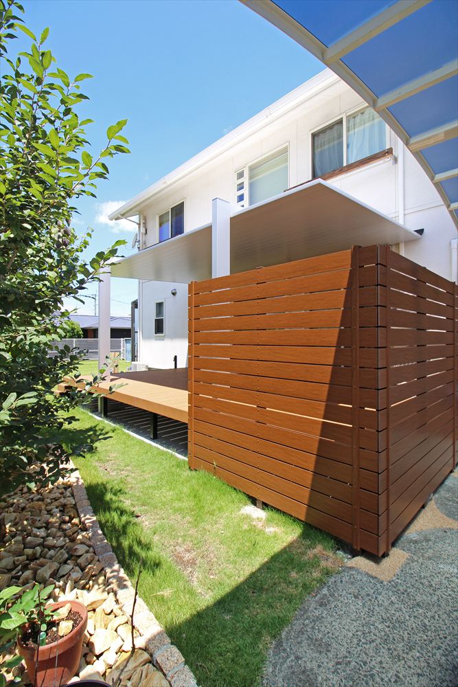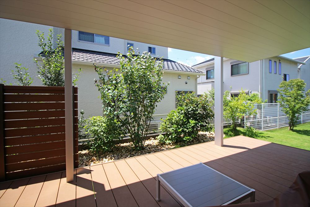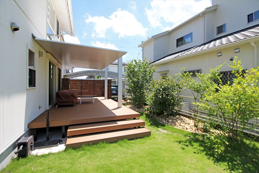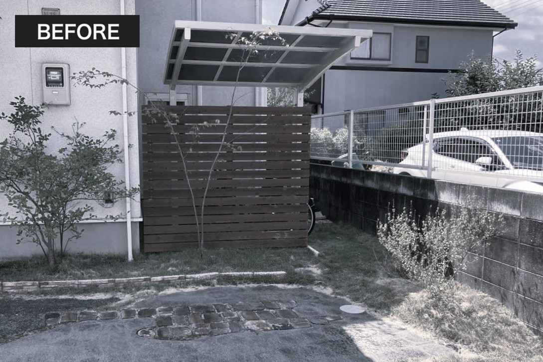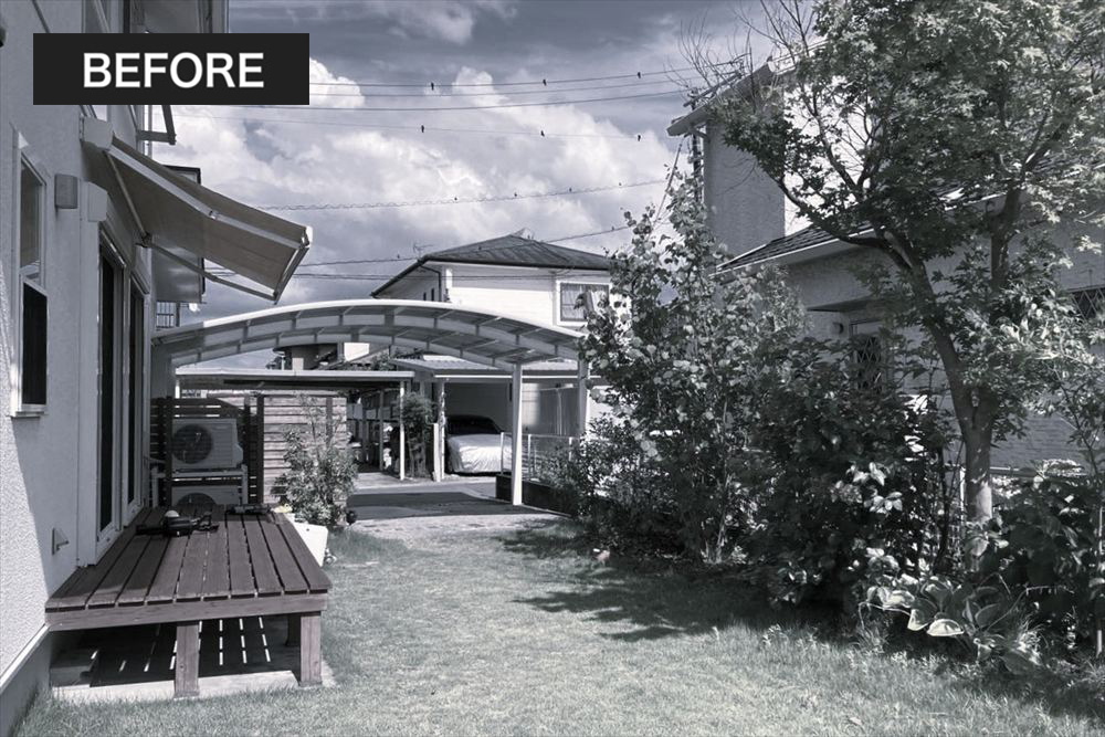 強い日差しを緩和すべく、遮光・遮熱効果の高い『LIXIL:テラスSC』を設置されました。十二分な広さの人工木デッキも新設し、涼しげな軒空間のようなガーデンテラスが完成しています。駐輪スペースは天然芝を撤去して段差も解消し、コンクリートで行き来しやすいよう仕上げました。植栽も整理することですっきりとしたファサードとなりました。