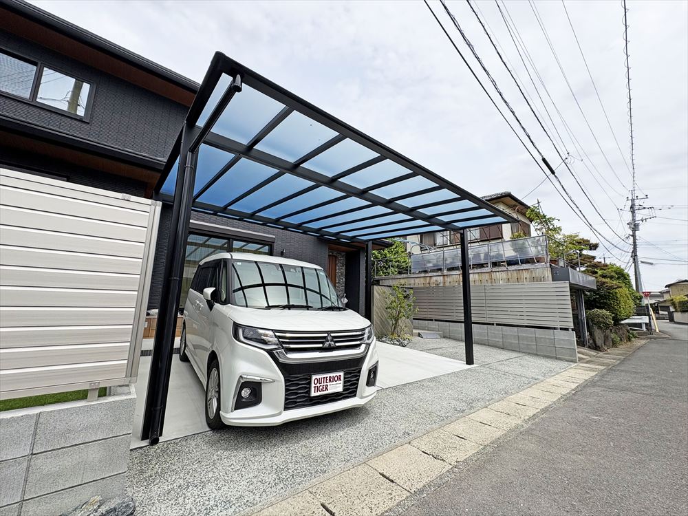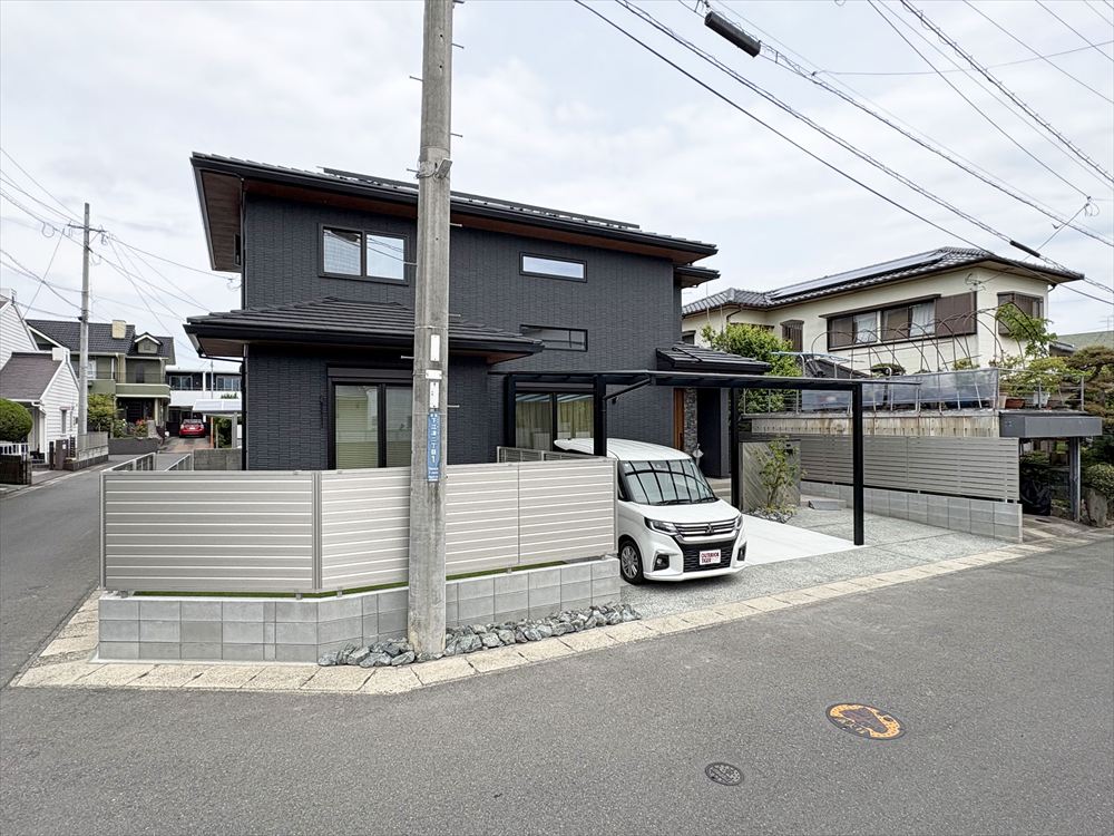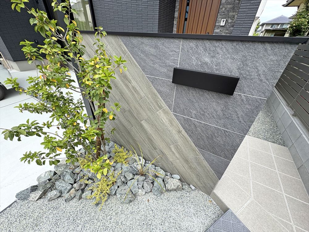 ダークな建物に調和する、モノトーンなオープン外構です。3台が駐車可能な車庫スペースは足元に洗い出しをあしらい、木調と石目調の2つのタイルを組み合わせた門柱がお客様を迎えます。段差を最小限にすることで、小さなお子様の外遊びも安心です。