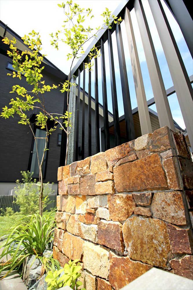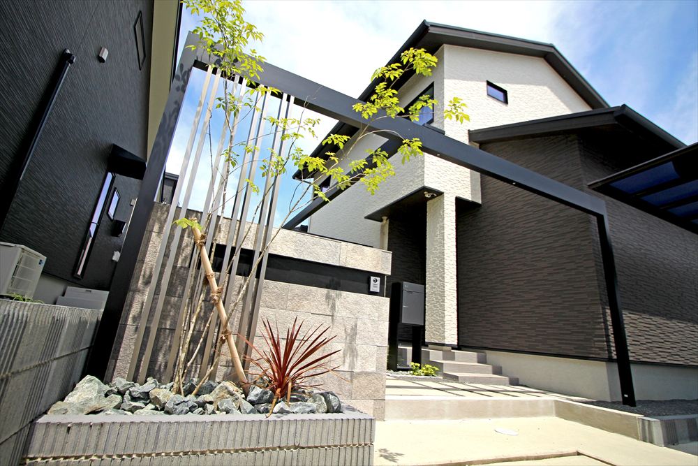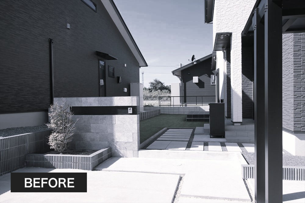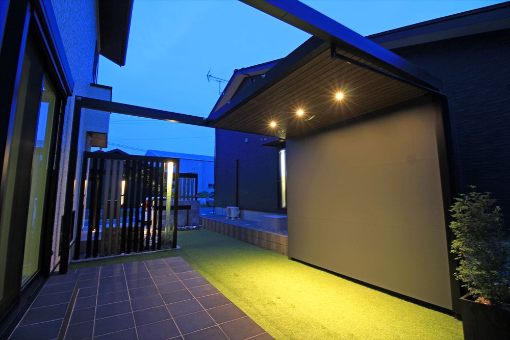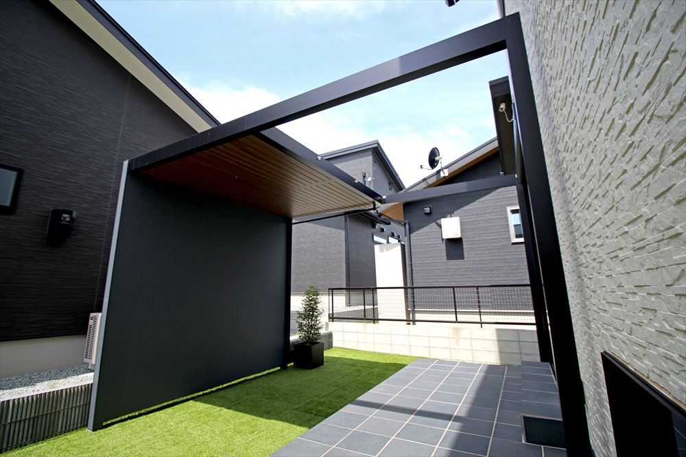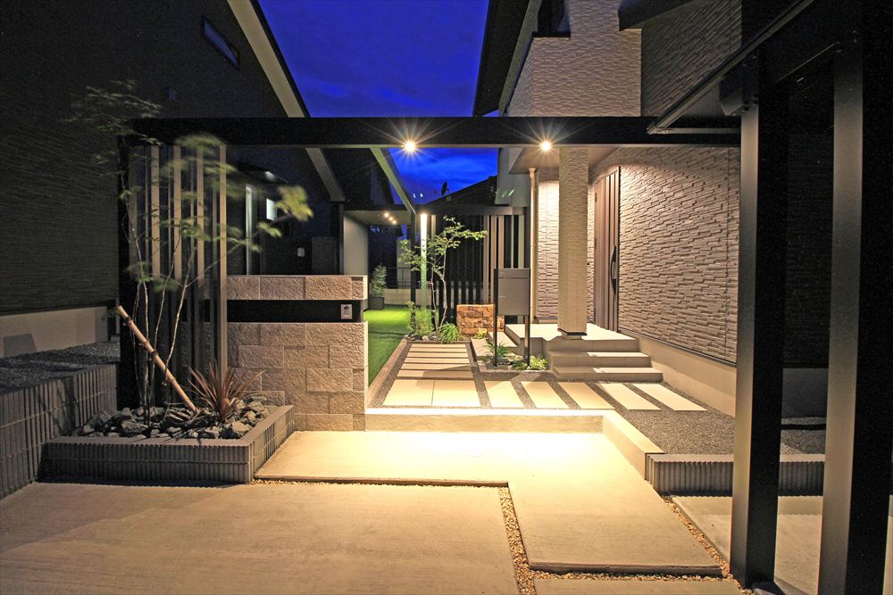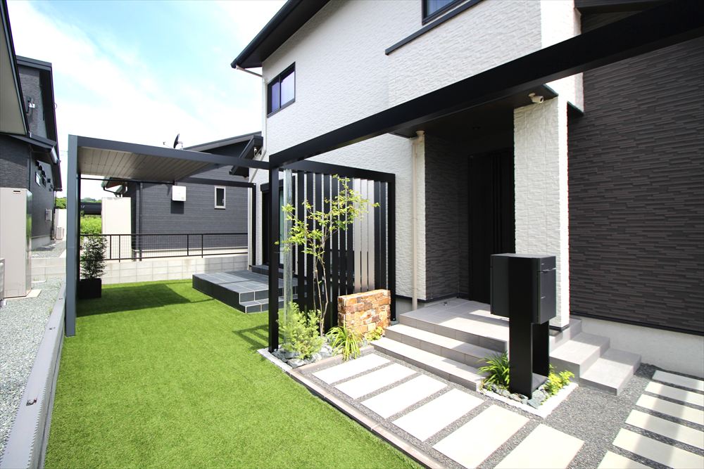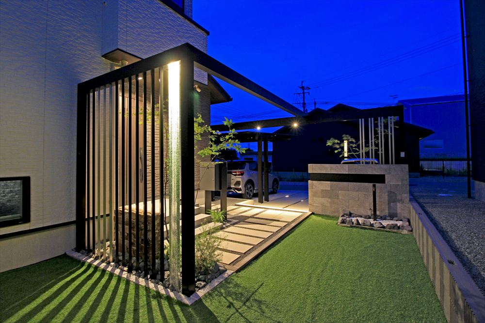 「既存の外構をよりかっこよくしたい」とのご要望から、 黒いフレームでお庭を間取ったリフォームプランをご提案しました。重厚感のある門廻り、玄関脇を程よく目隠しする格子、心地よい影を作るルーフ。隣家が接近していることからウォールを立てることでプライベート感を高め、小さなお子様が安心して遊べるよう心掛けました。夜には煌めく光が美しく、神秘的なひとときをお楽しみ頂けます。