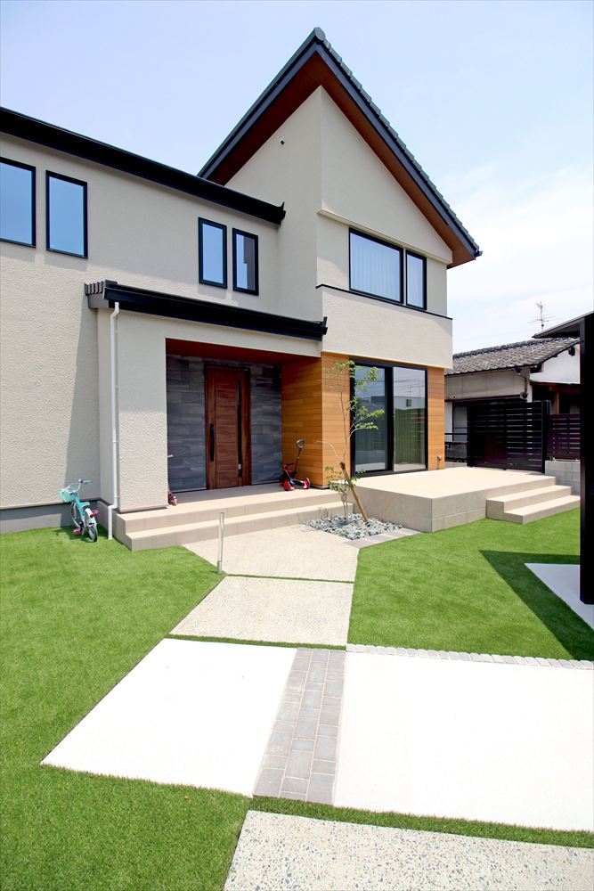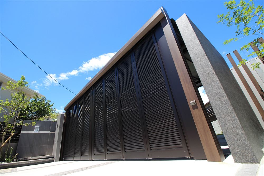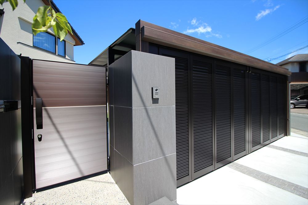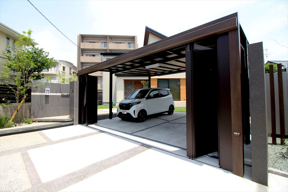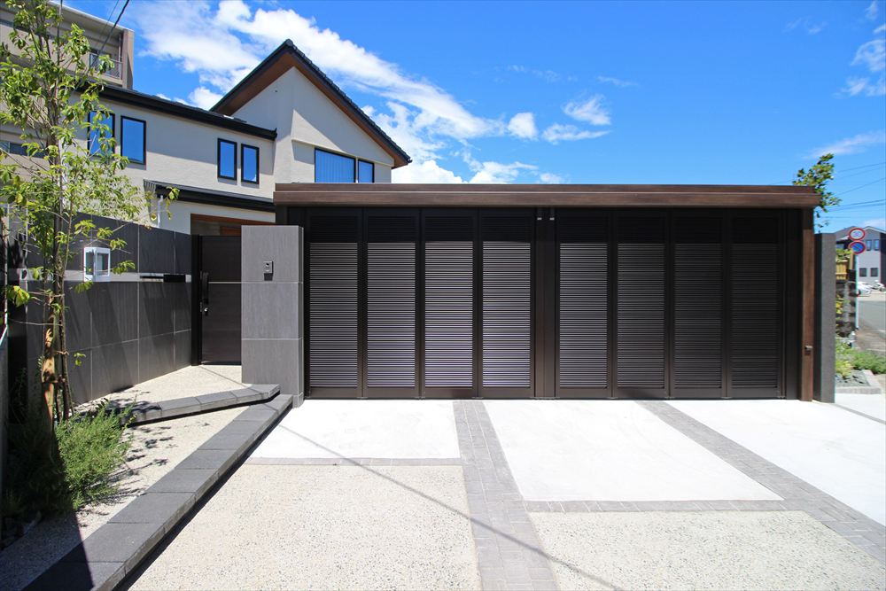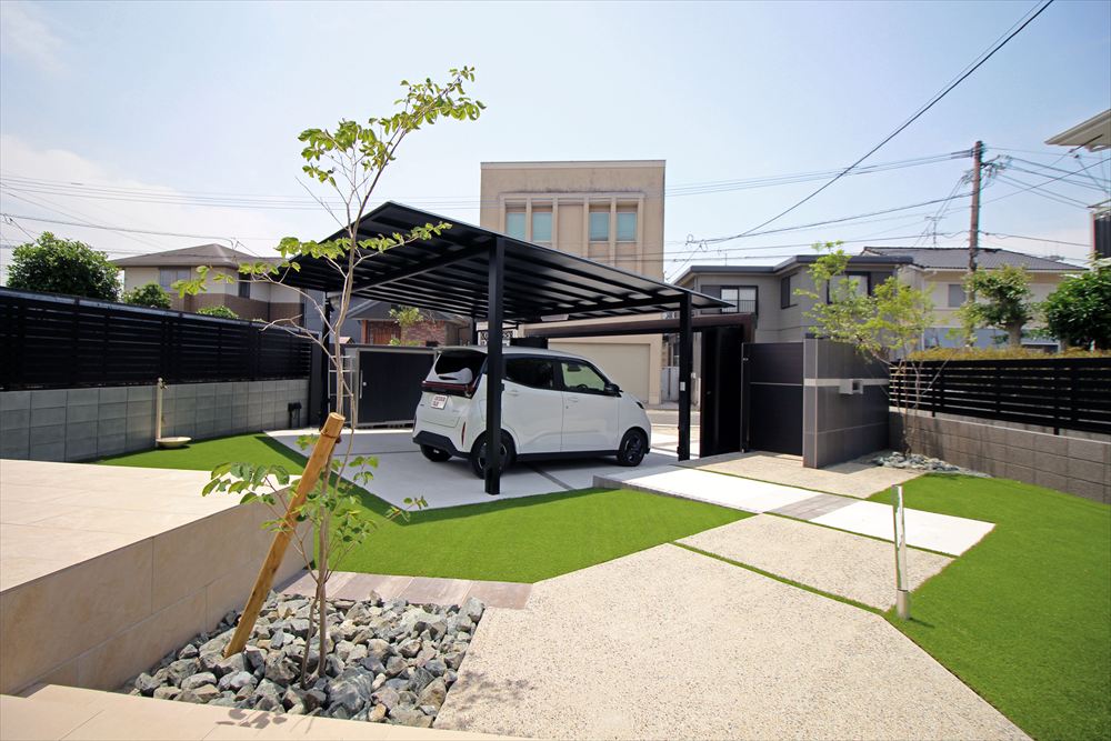 周囲を気にせずゆっくり過ごせるように、高さのあるウォールや門扉、シャッターゲートでしっかり囲ったクローズ外構です。石目調の大判タイルを使用した門廻りとブラックポリカのカーポートでシックな佇まいのファサード。その奥に広がるお庭は人工芝とアプローチの色調が鮮やかで、対照的な色遣いが印象的です。