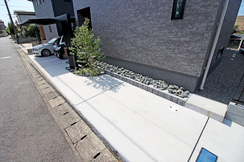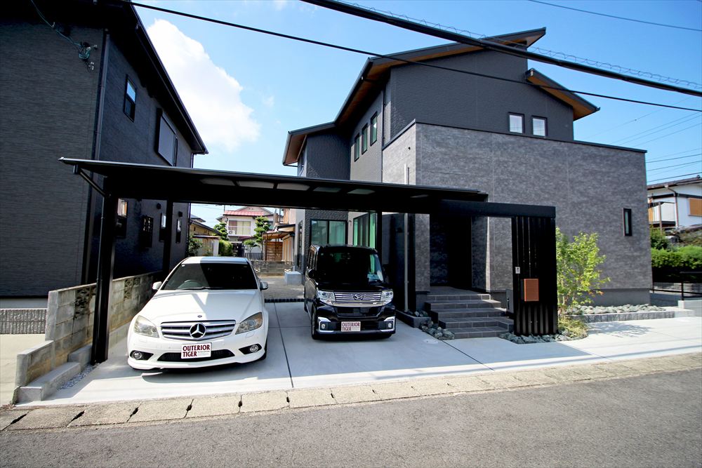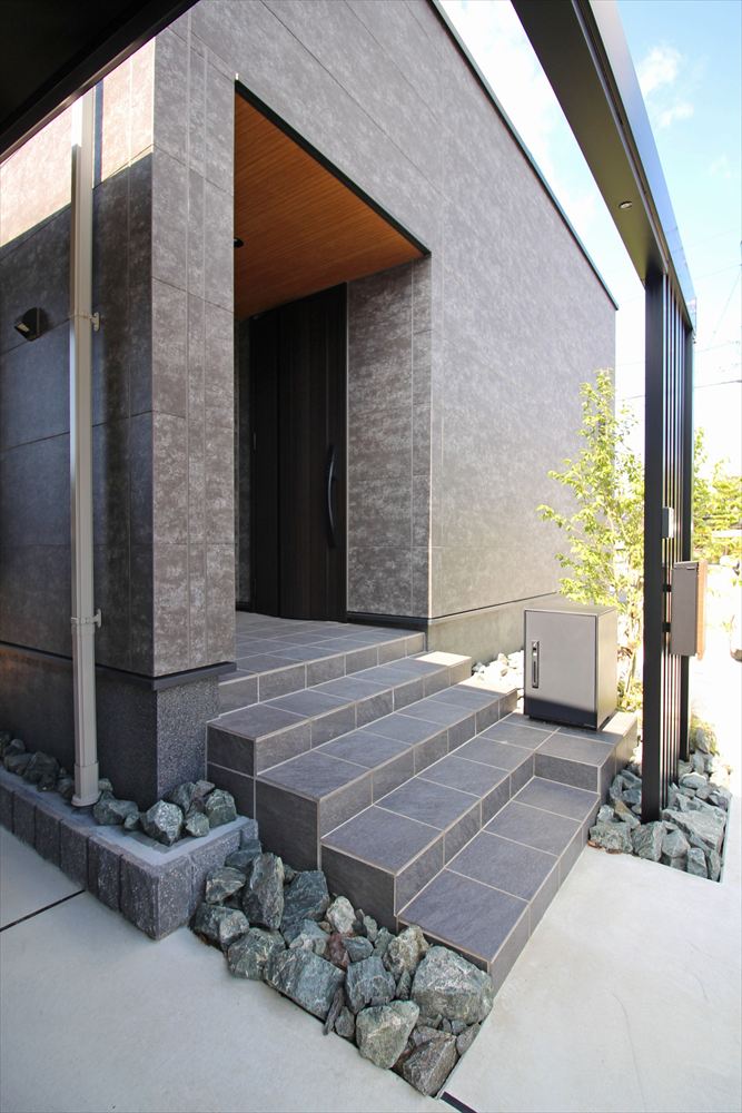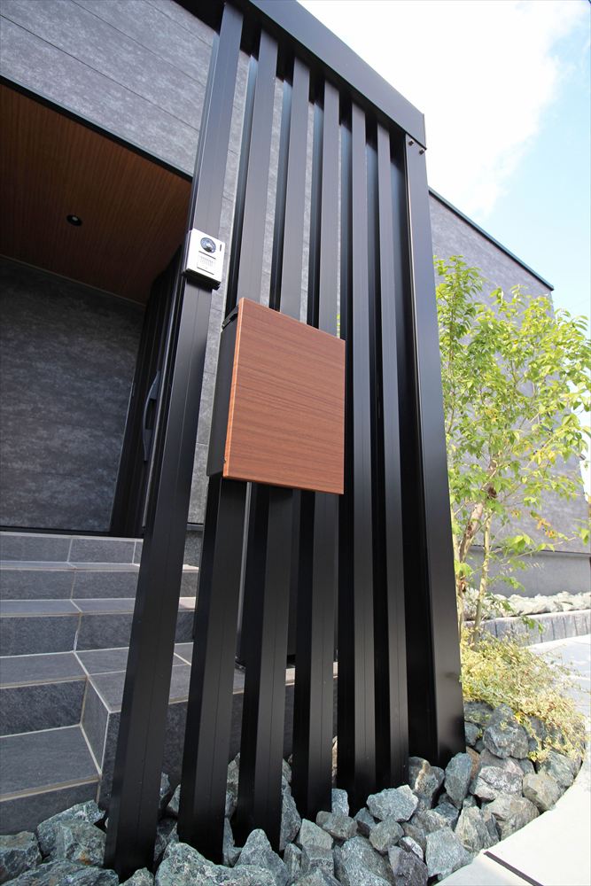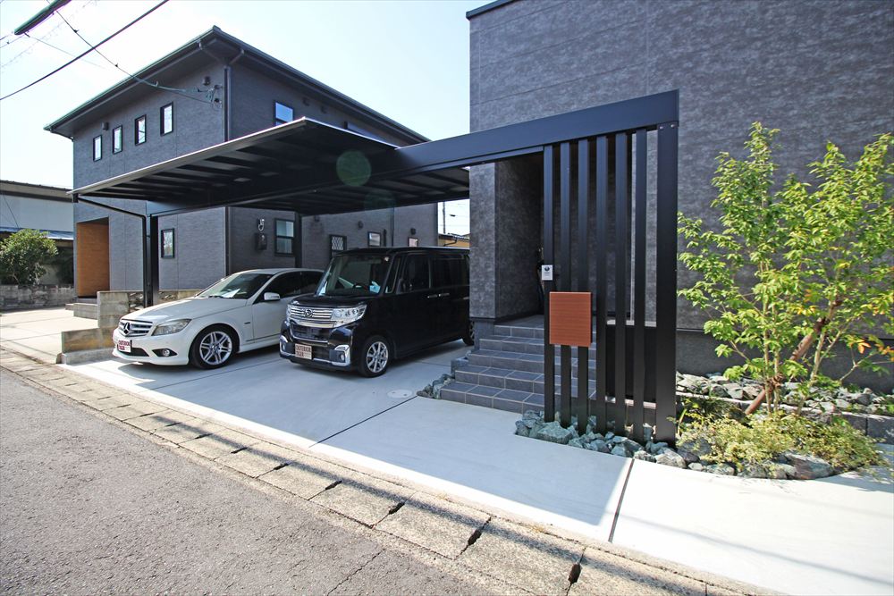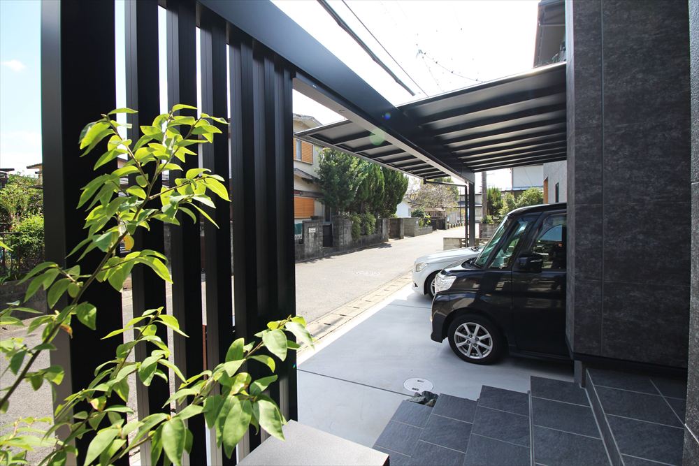 梁延長したカーポートで魅せるかっこいいファサード。延長部分には玄関前の目隠しとして格子材を設置し、表札・ポスト・インターホンを備えて門柱の役割を担います。ブラックポリカを採用したシックなカーポートが建物を引き立て、ヤマコウバシの艶めく葉が鮮やかに映えます。