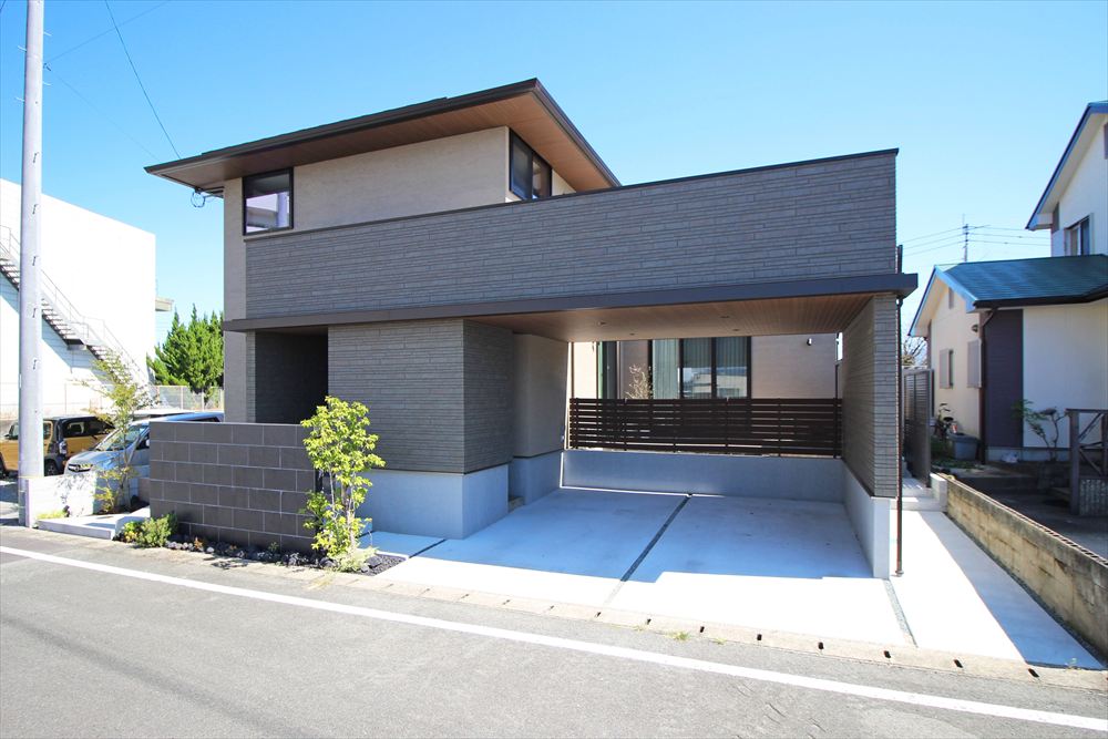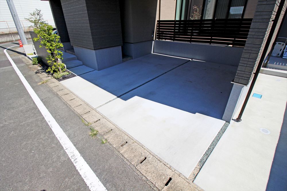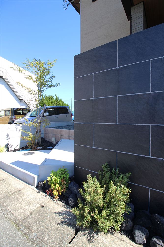 玄関前を覆う大きなウォール。爽やかな樹木の緑が寄り添う存在感のある”黒”が目を引きます。 階段・アプローチのゆったりとした導線がゆとりあるファサードを演出し、建物と一体型となった車庫スペースはコンクリートでさっぱりと仕上げました。 こだわりの建物に調和するシンプルモダンなエクステリアです。