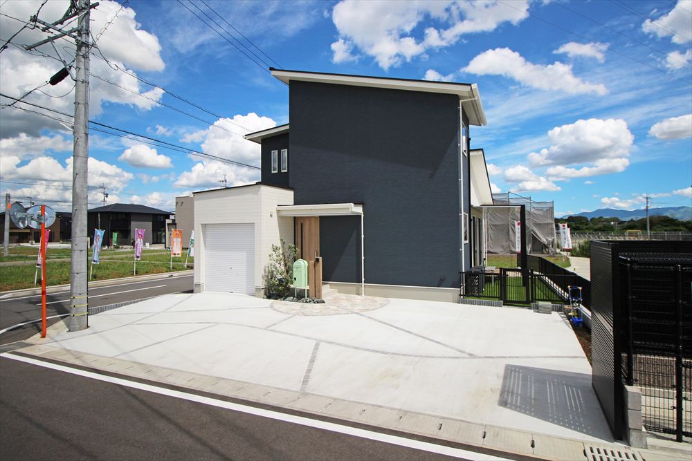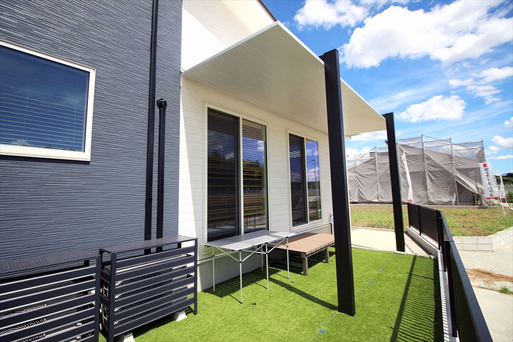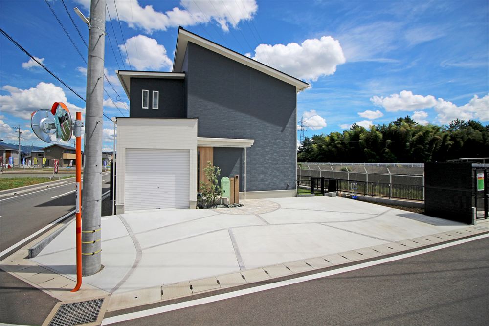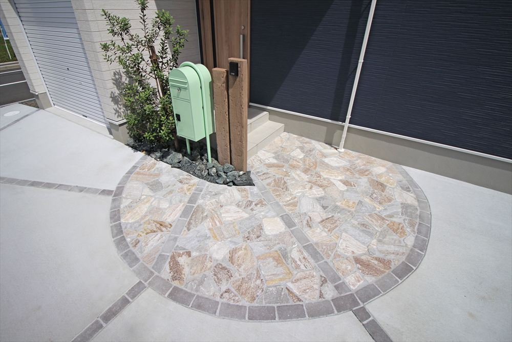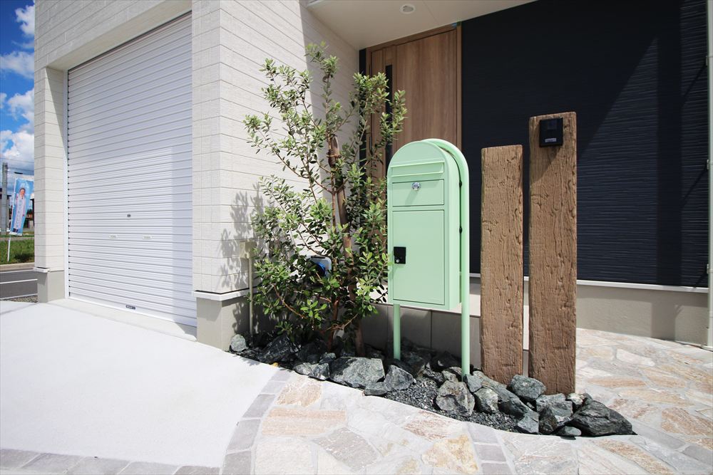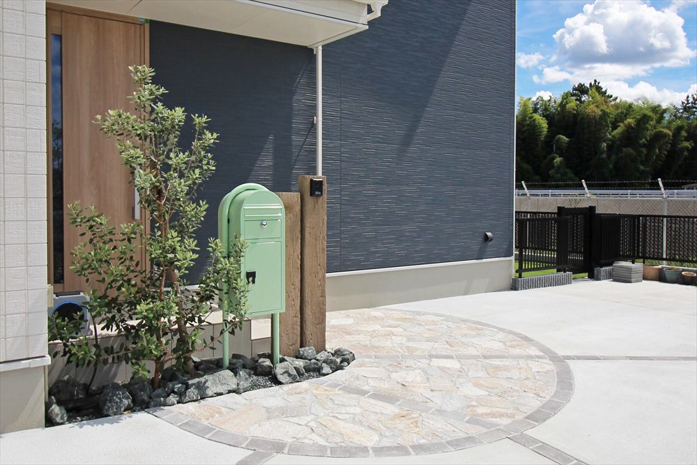 玄関前に重きを置いたファサード。アイスグリーンの宅配ボックスとコンクリート製の枕木のナチュラルな雰囲気がネイビーの建物によく映えます。広い車庫土間にはレンガや自然石でかわいいアクセントを入れました。ワンちゃんの飛び出しを防ぐためお庭はフェンスでしっかりと囲い『LIXIL:テラスSC』が涼しい影を作ります。