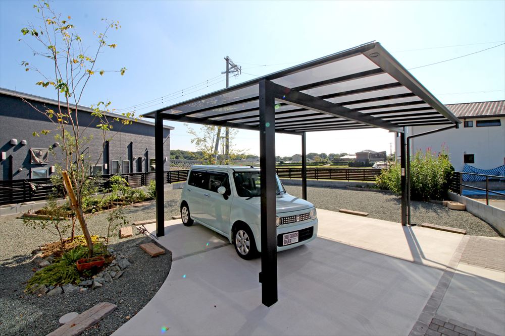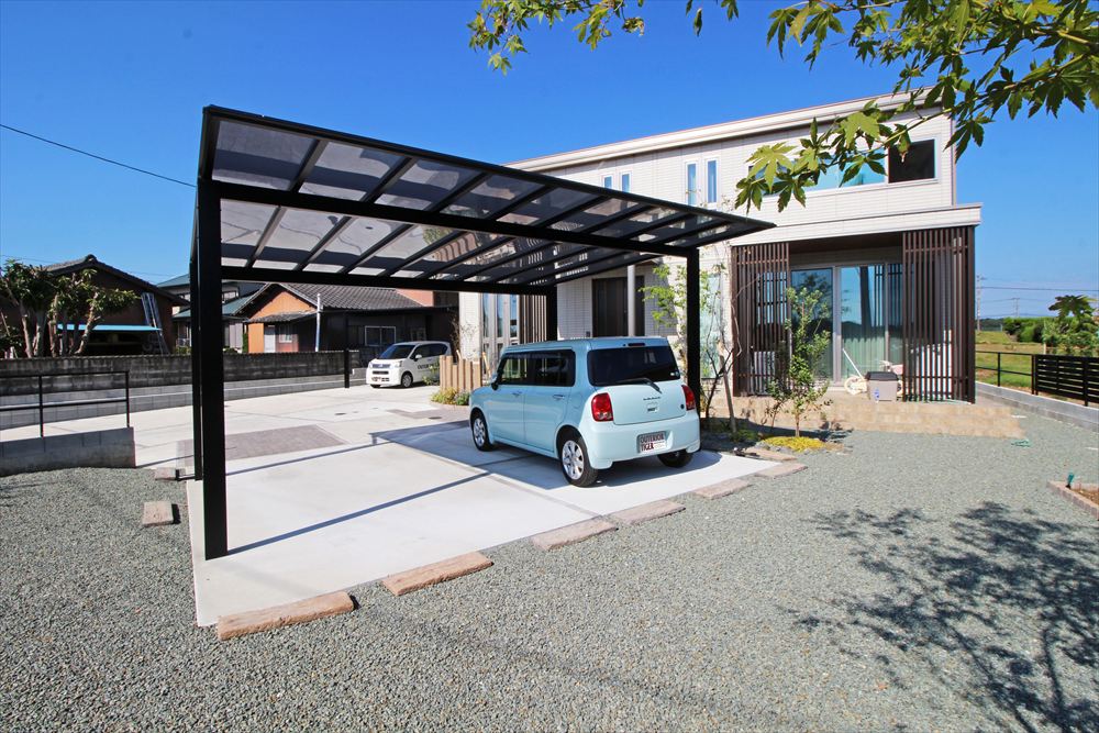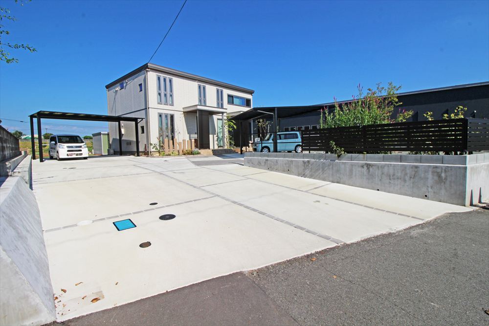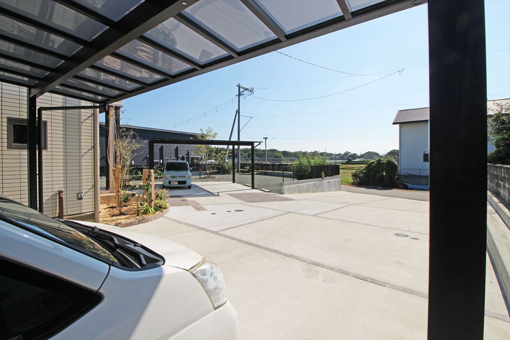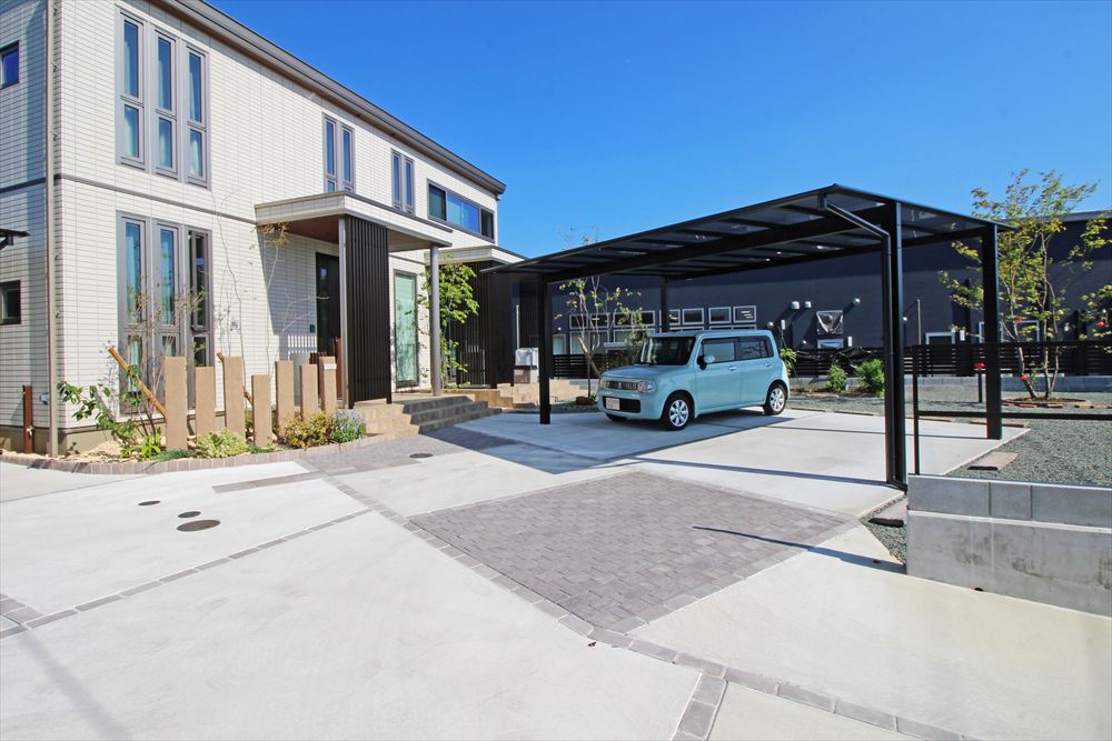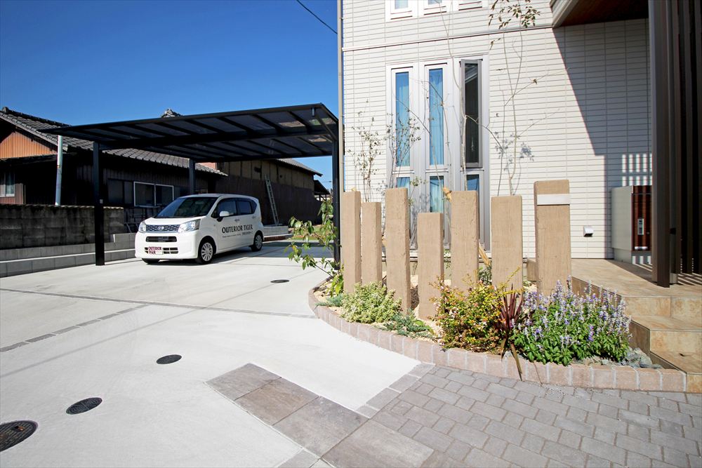 広いお敷地に植栽を多用したナチュラルなエクステリア。4台分の駐車スペースはなるべく玄関近くに欲しいとのご希望に沿い、建物の正面と側面の2ヶ所に2台ずつのカーポートを配しました。土間が単調にならないよう透水性の舗装材でアクセントを加え、植栽に調和する柔らかな様相に…。門柱に見立てたコンクリート製の枕木がナチュラルな雰囲気をより一層高めています。