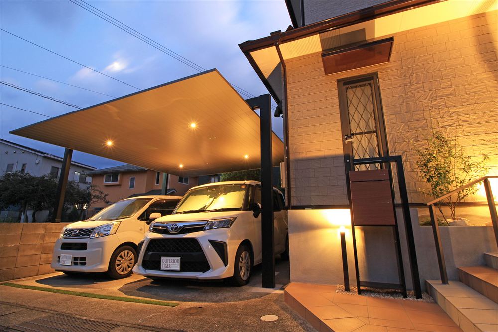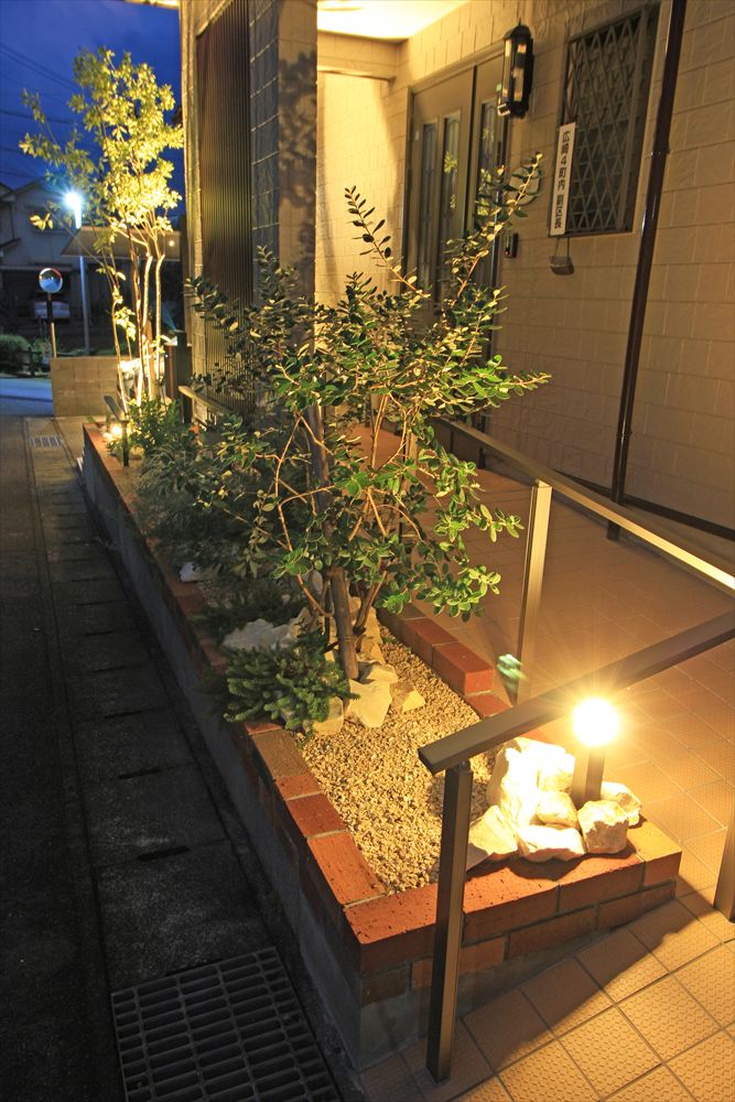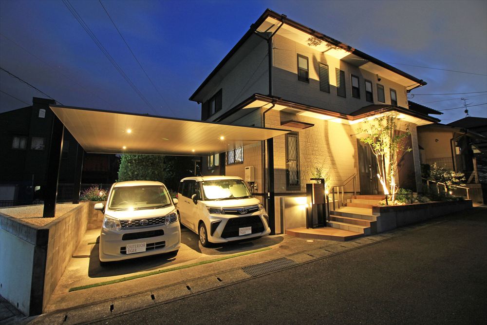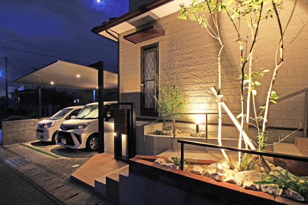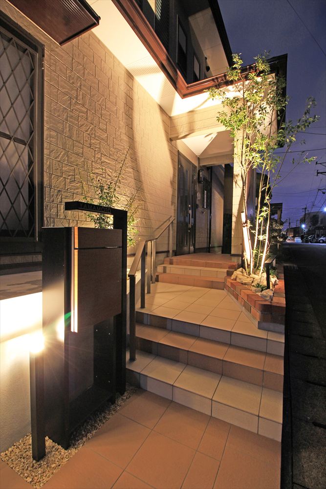 街灯の少ない住宅街のなかで明るく輝やくY様邸。リフォームに伴い照明を多用し、これまで暗く不便だったファサードを光で包みました。