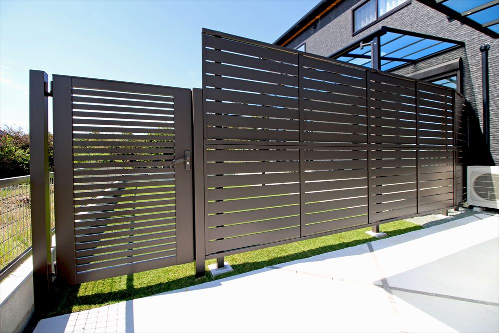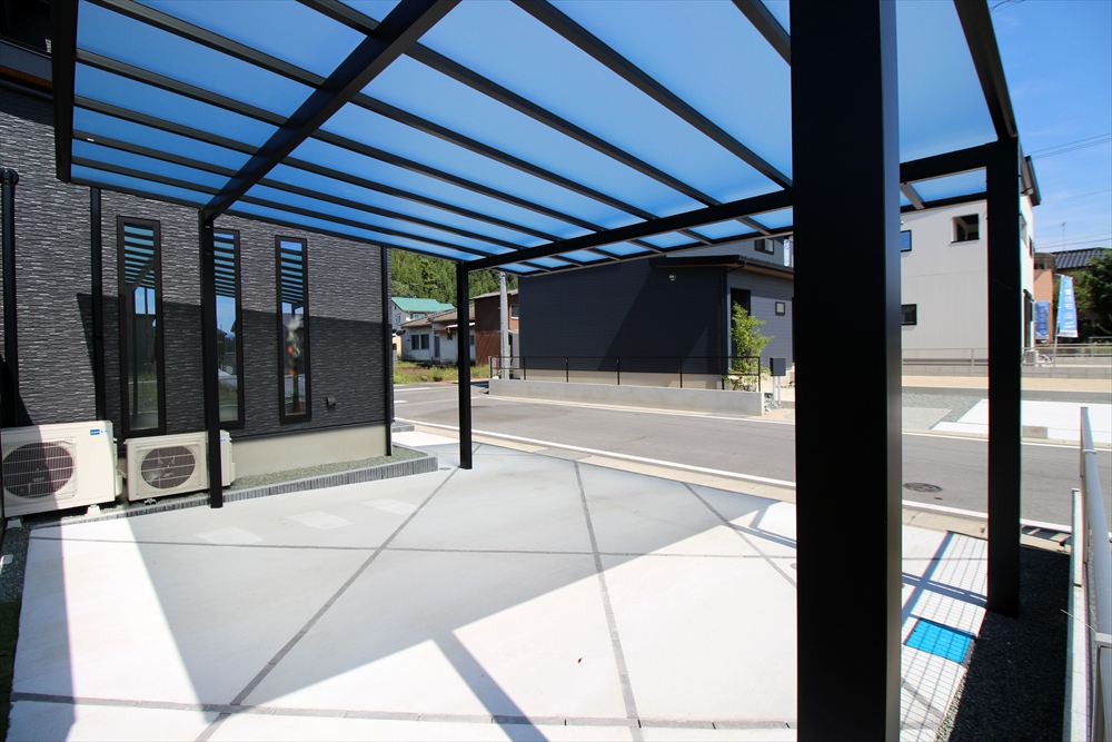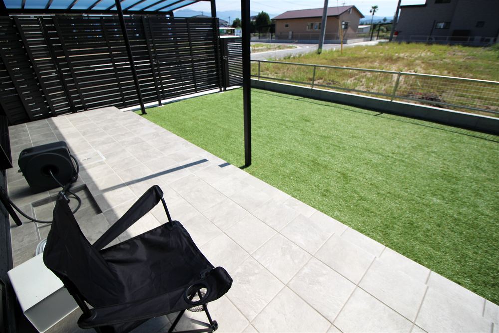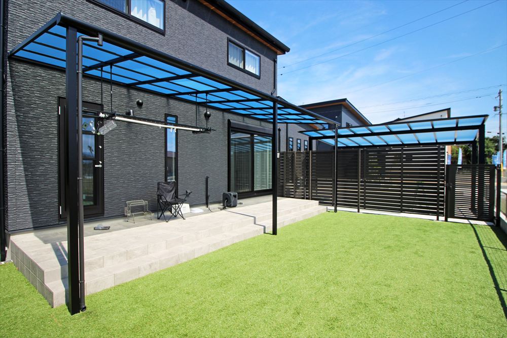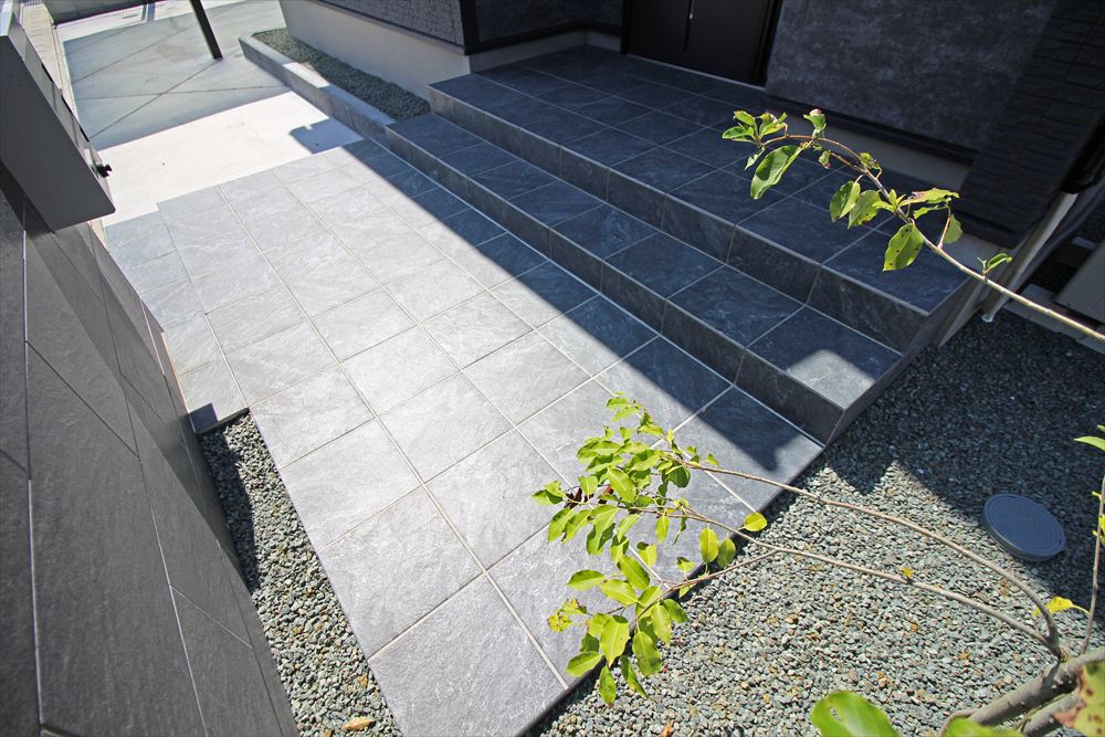 門柱は敢えて幅広にデザインし、空間をゆったりと使った階段・アプローチと合わせてダークなタイルで仕上げかっこいいファサードを演出しました。お庭はクローズしてプライバシーに配慮。既存のタイルテラスを拡張して大きく屋根をかけました。DIYでご主人様が施工された人工芝の緑が美しく広がり、外からの視線を気にせずゆっくり過ごせる空間となりました。