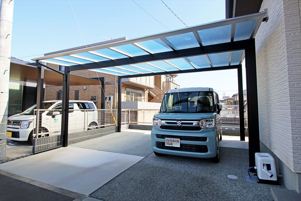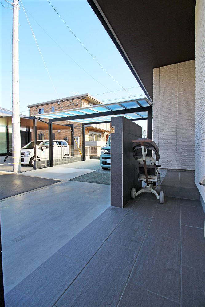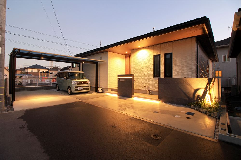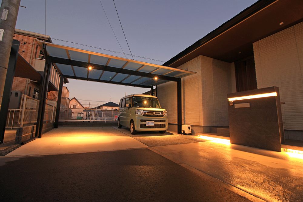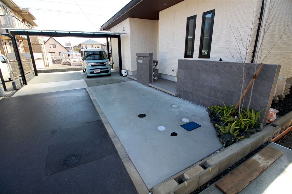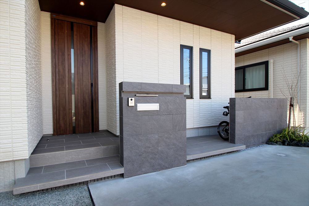 玄関ポーチに寄り添う2枚の門柱は、サイズを変えることでさりげない立体感と奥行きを演出し、効果的な目隠しとしてファサードの使い勝手をUPさせました。車の進入の妨げにならないよう配した植栽は視線を遮りすぎず程よくプライバシーを守り、自然との一体感を感じられる空間となっています。