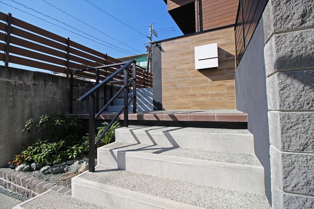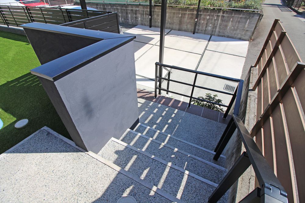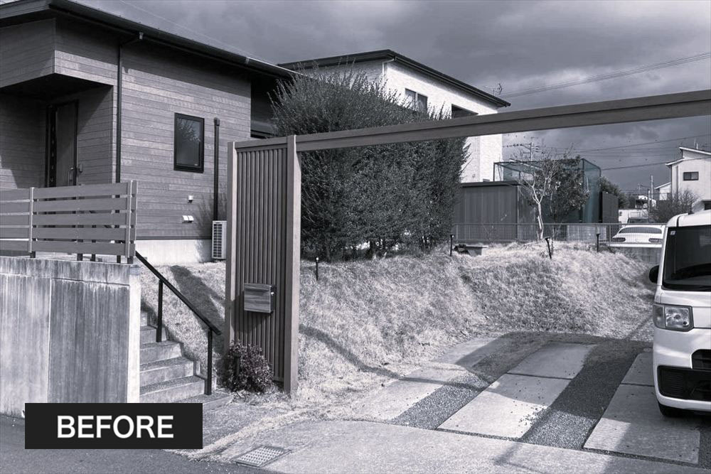 高さのある法面や植栽のお手入れにお困りだった施主様。しっかり土留めを入れることで車庫とお庭を確立させすっきりとした佇まいへ…。 新設した門柱は建物外観に合わせて木調タイルで仕上げ、段数の多い階段は敢えてクランクさせることで圧迫感を軽減しました。手狭だったお庭は広々と生まれ変わり、メンテナンスフリーの人工芝の美しい緑が心地よく広がります。