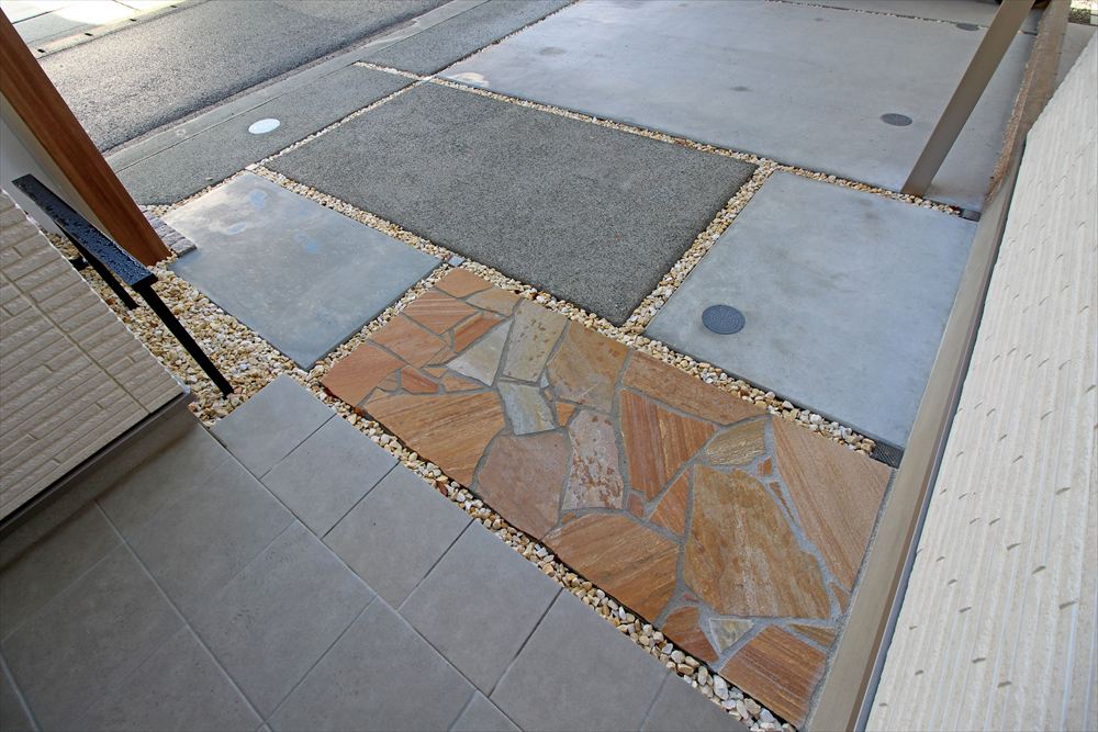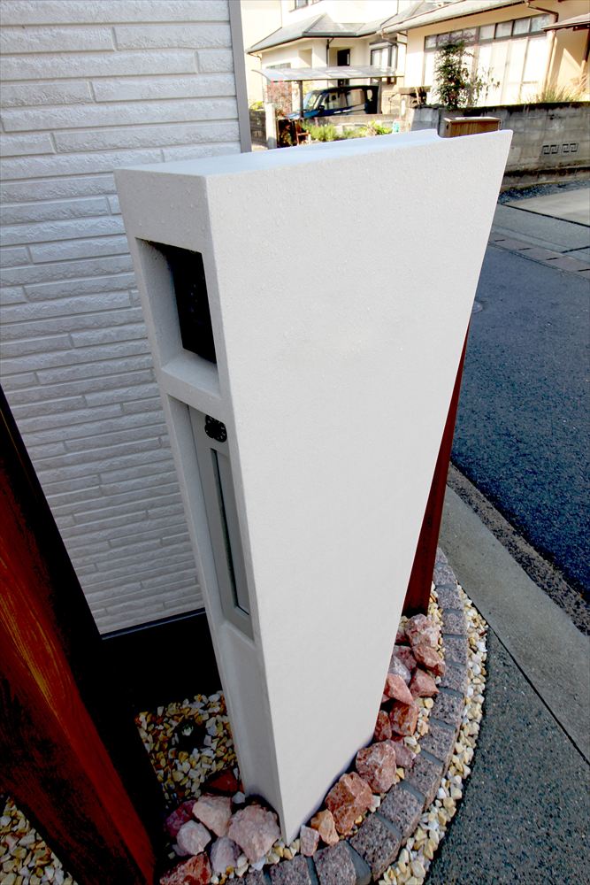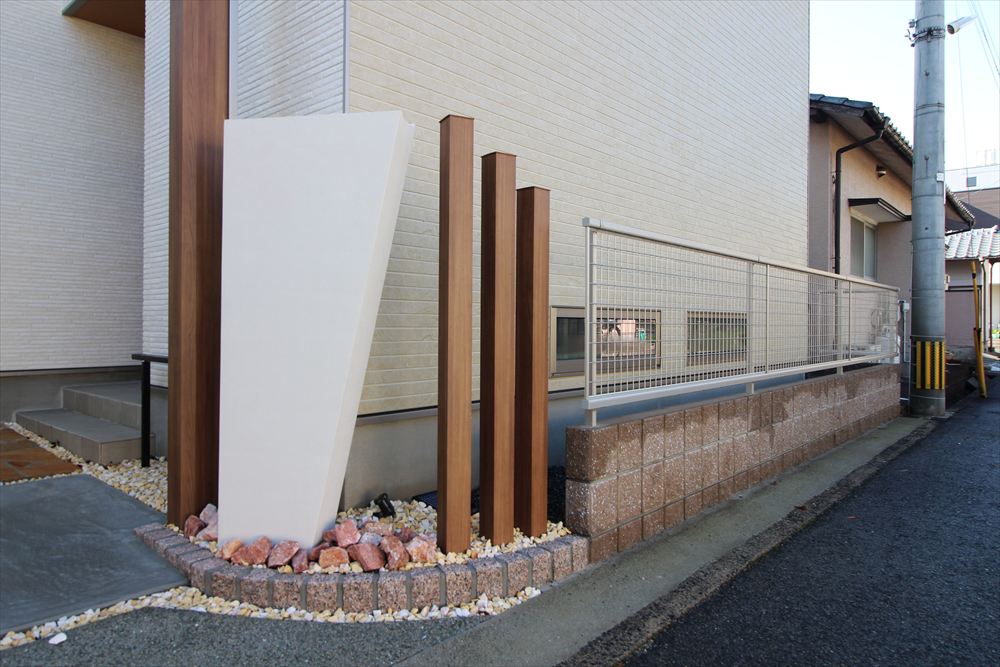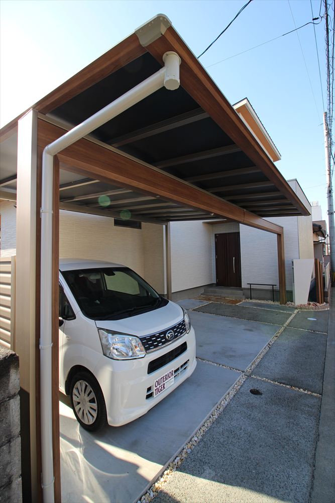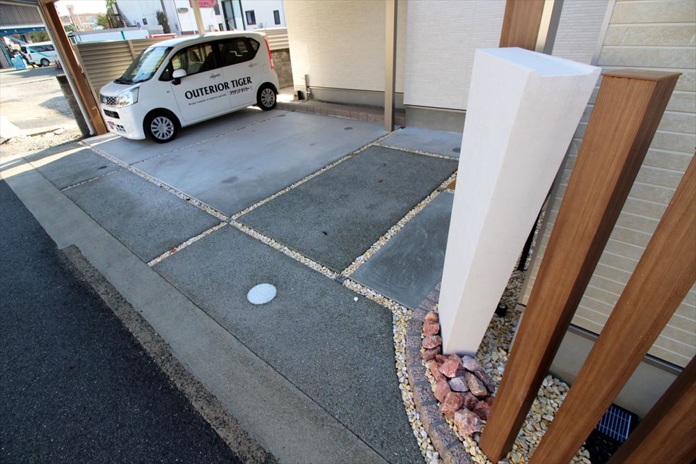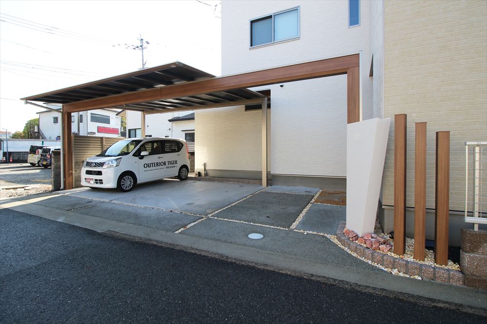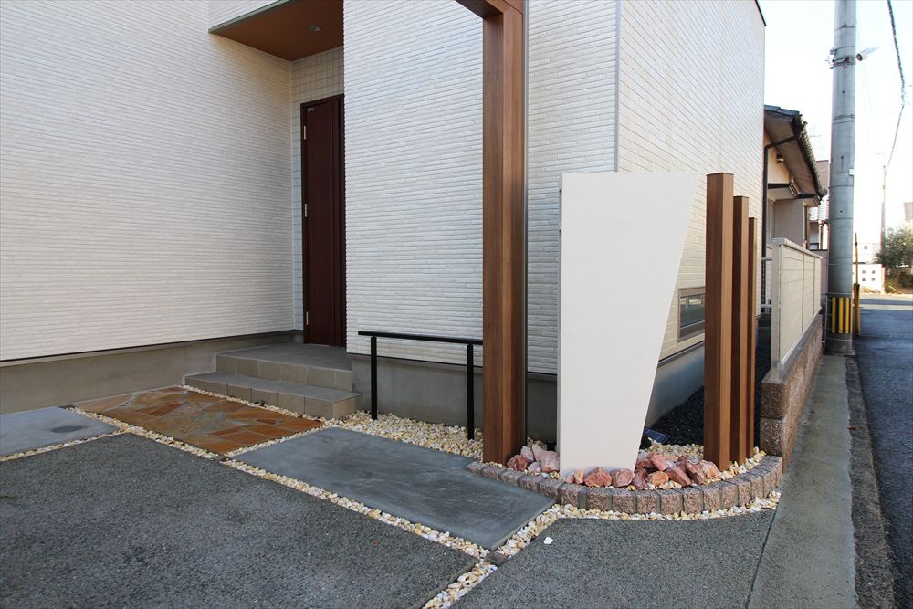 まっ白な建物に寄り添うのは木調色の柱にブラックポリカの屋根がかっこいい『三協アルミ:スカイリード』。前方の梁を建物まで伸ばすことで広い間口が引き締まり空間が際立ちます。玄関脇には逆三角形のフォルムが印象的な機能門柱『ルアン』を据え、優しい表情でお客様を迎えます。