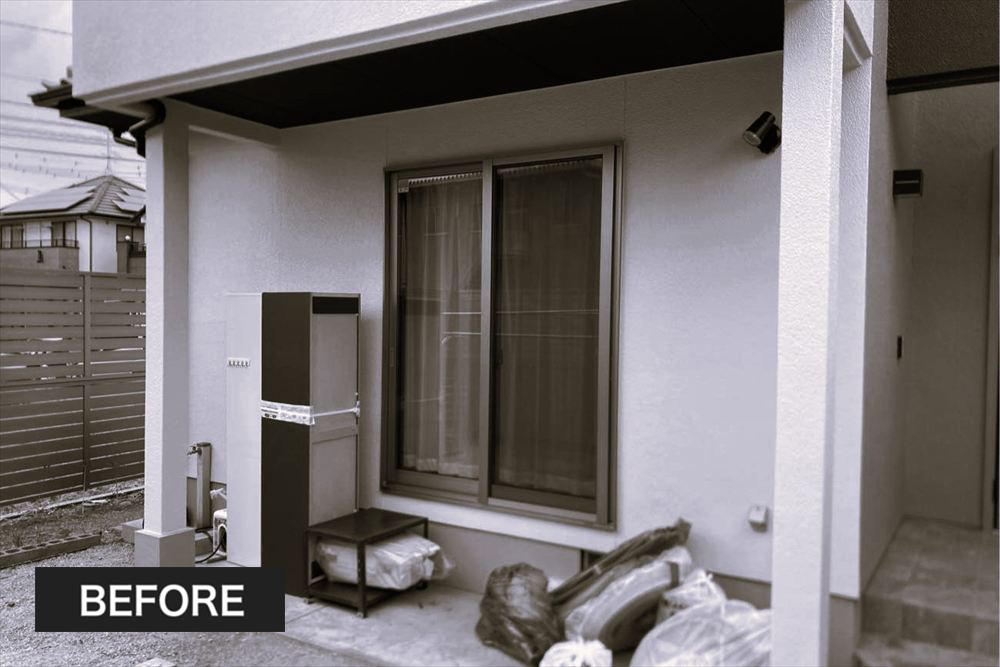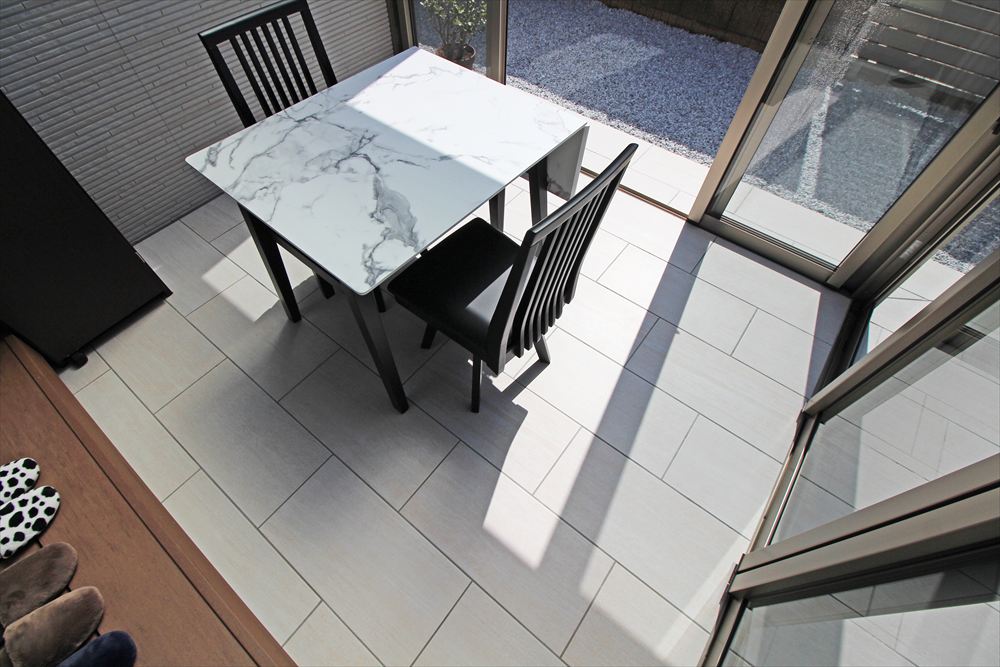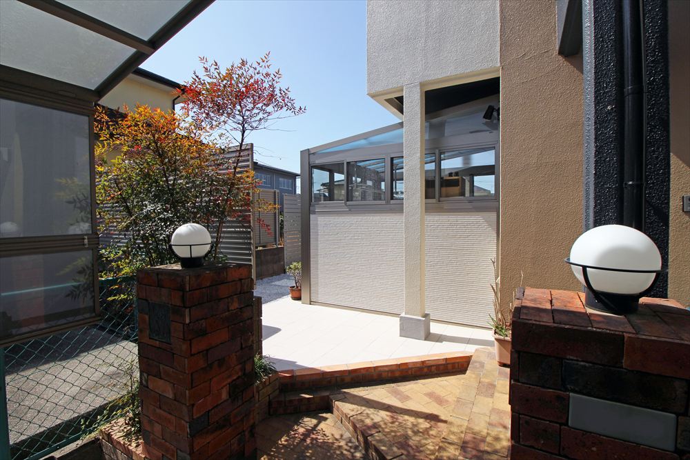 もうひとつのお部屋としてガーデンルーム『ハピーナ リラ』を新設された施主様。視線が気になる道路側にはハイタイプの腰壁を据えプライベート空間を確立しました。室内から段下がりのフロアは艶めくタイルで上品に仕上げ、外側は滑り止めタイプに仕様を変えて玄関まで誘います。お庭一面に施した白い砂利で庭空間を明るく爽やかに演出しました。