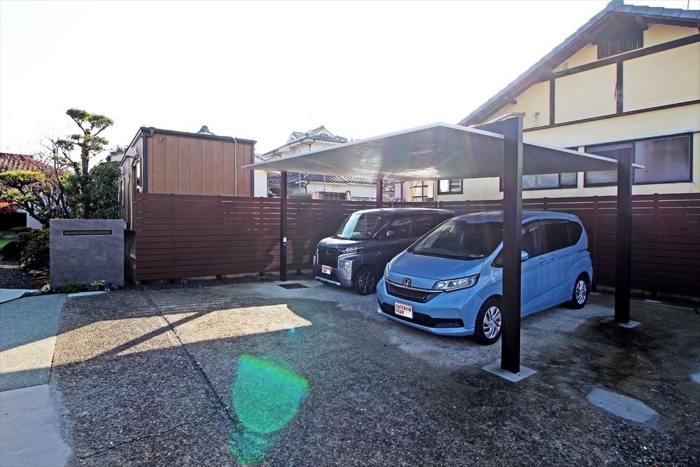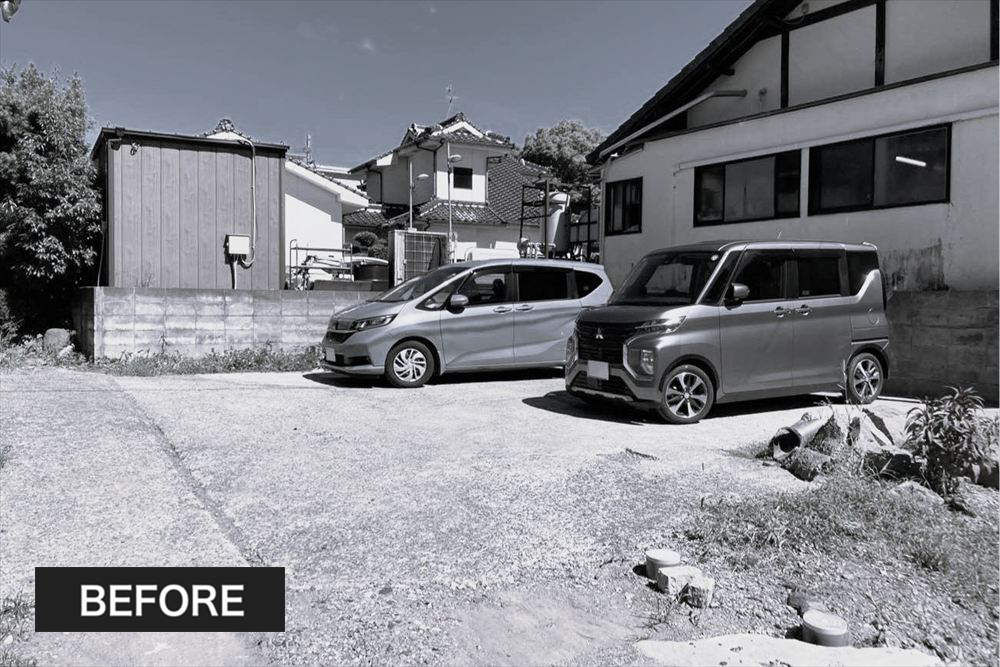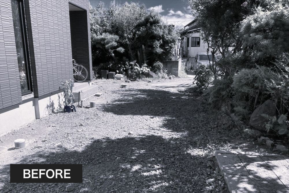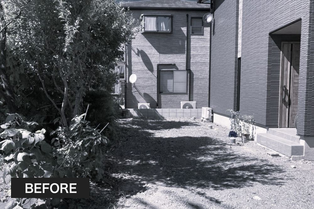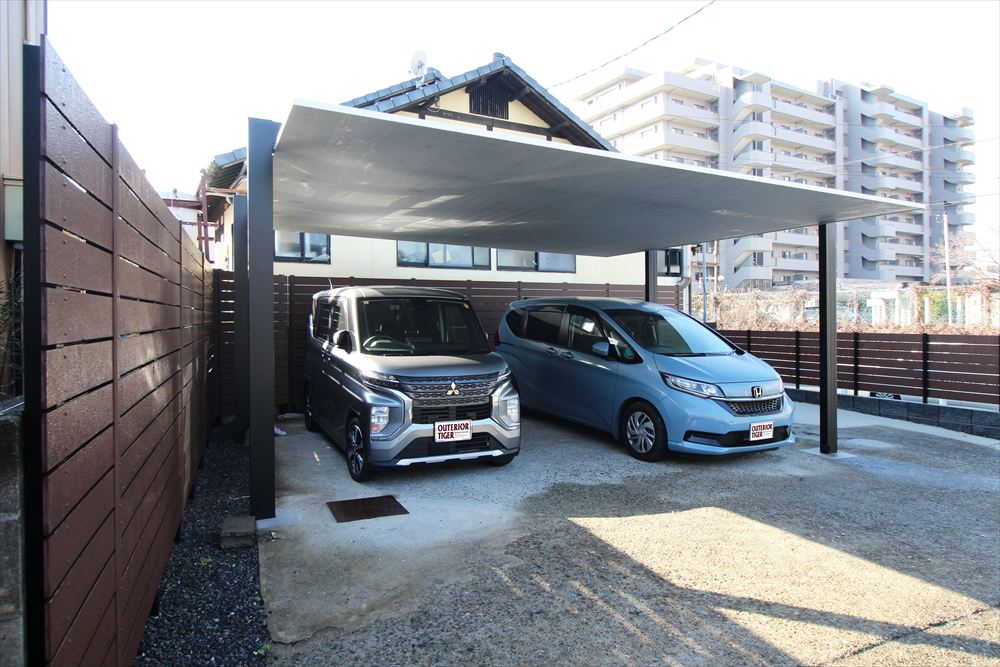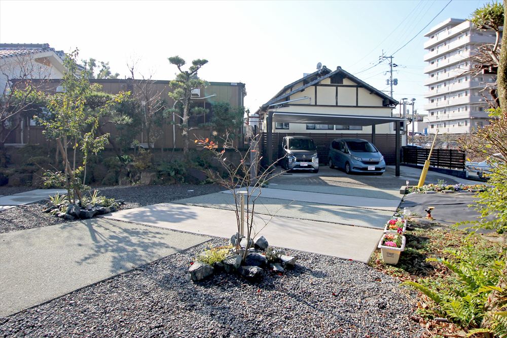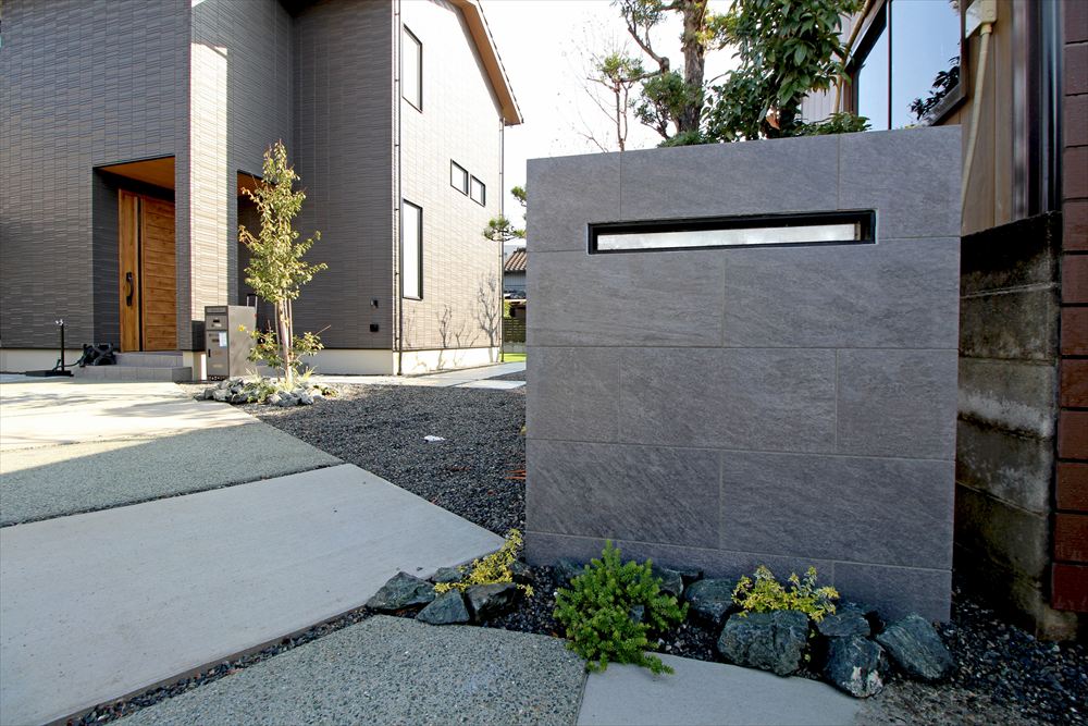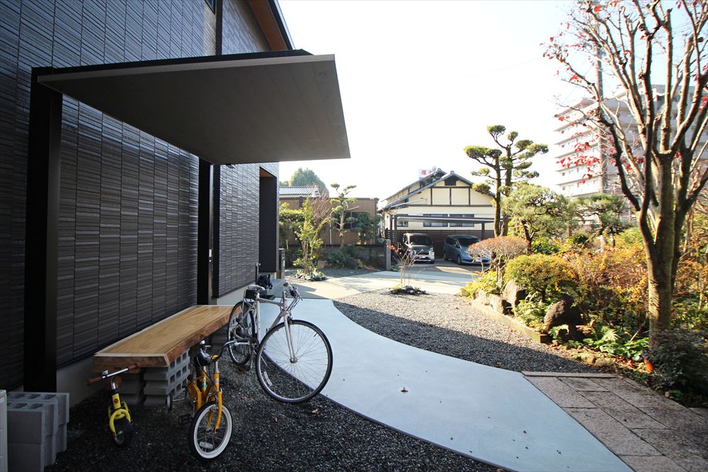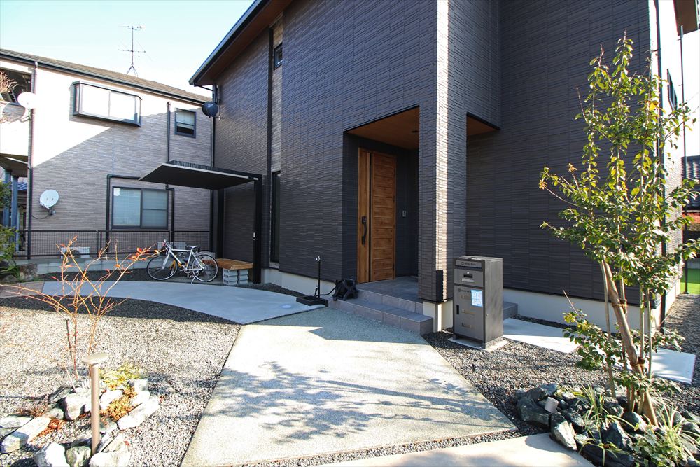 侵入口が狭いことから、敷地内で車の切り返しができるようアプローチを兼ねた土間デザインをご提案しました。門柱は石目調のタイルとガラスの表札でシックに仕上げ、ポストは玄関脇に配することで利便性をUPしています。 駐輪スペースも設け、カーポートとお揃いの屋根で統一感のある景観となっています。
