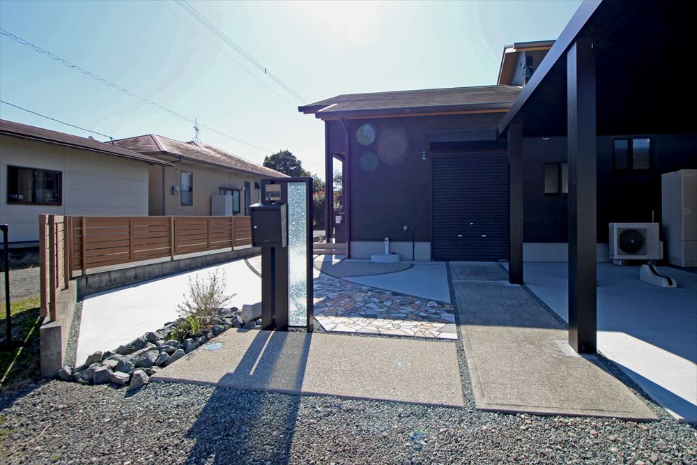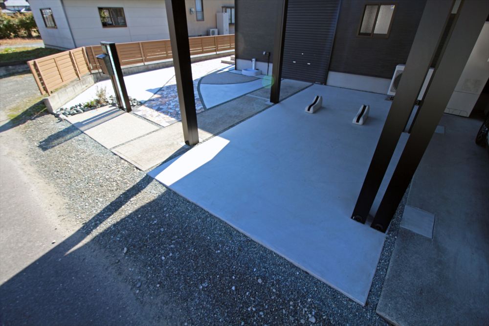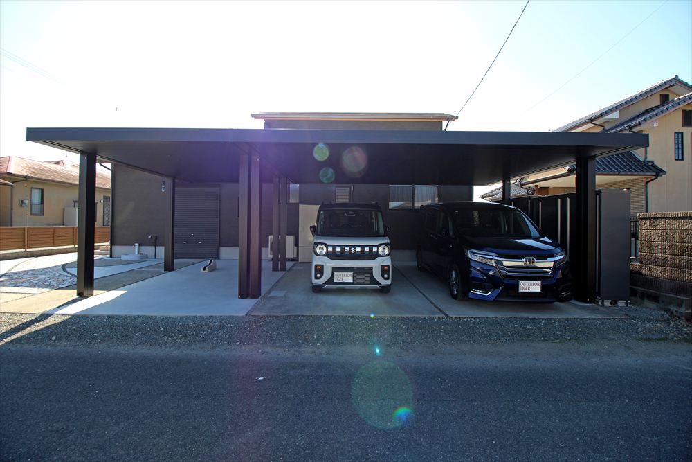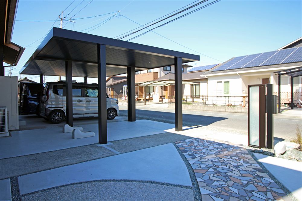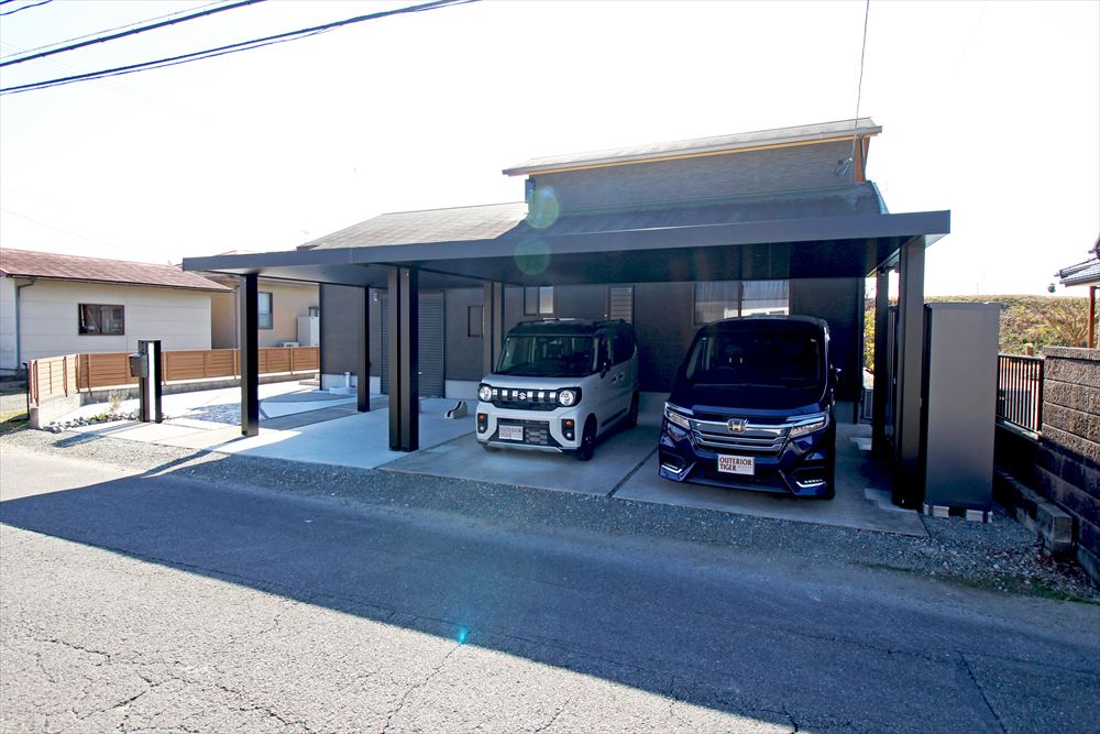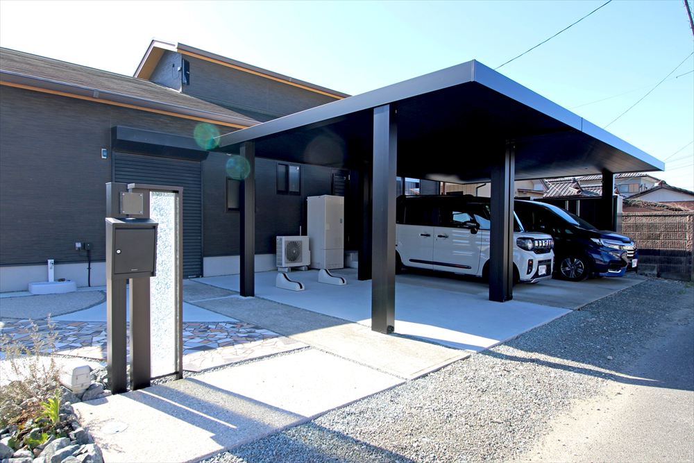 既存の車庫スペースに新設したカーポートはフラットな意匠でノイズレスにこだわった『三協アルミ:ビームス プレミアムタイプ』。重厚な佇まいが存在感を放ちます。門柱もガラスが輝く機能門柱に姿を変え、お広い間口を存分に生かしたリフォーム工事となりました。