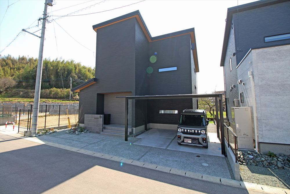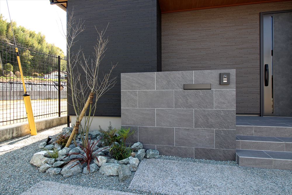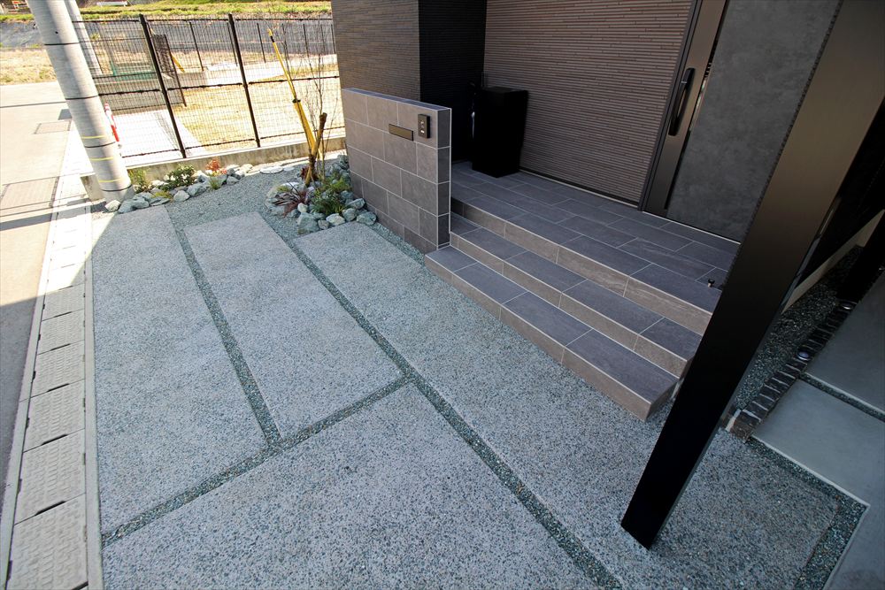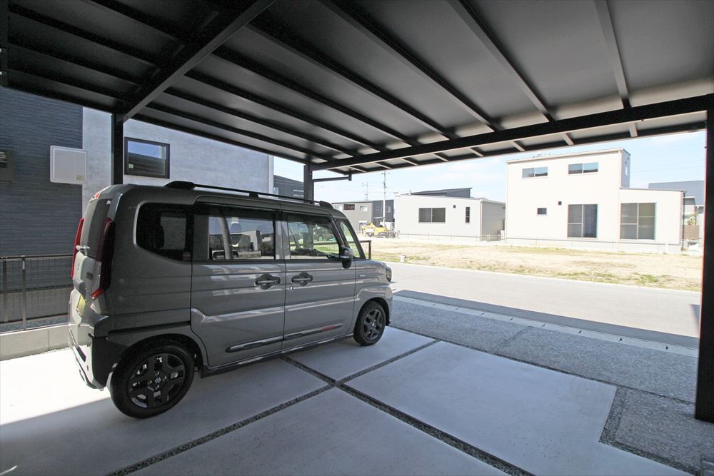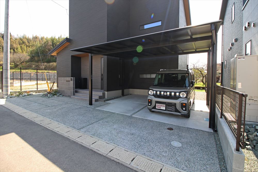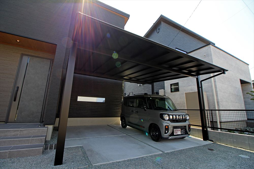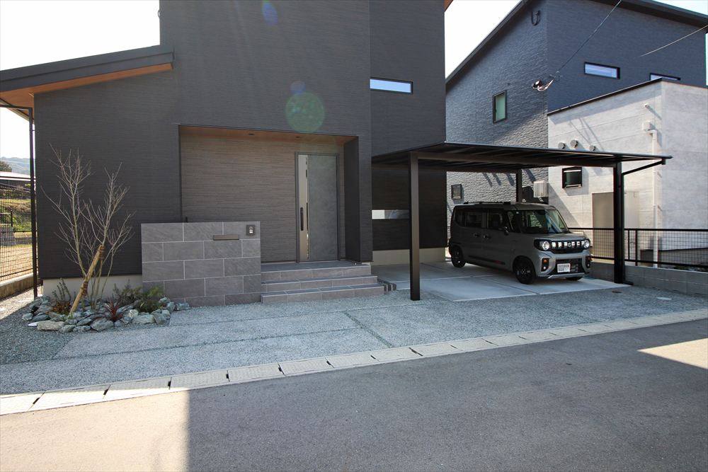 モダンな建物に寄り添うシックなファサード。門柱は玄関ステップと色を合わせることで建物に調和し、石目調タイルで凛とした美しさを演出しました。カーポートはブラックのフォルムが存在感を放ち、シャープな佇まいが建物を引き立てます。単調にならない土間デザインで柔らかな雰囲気をプラスしました。