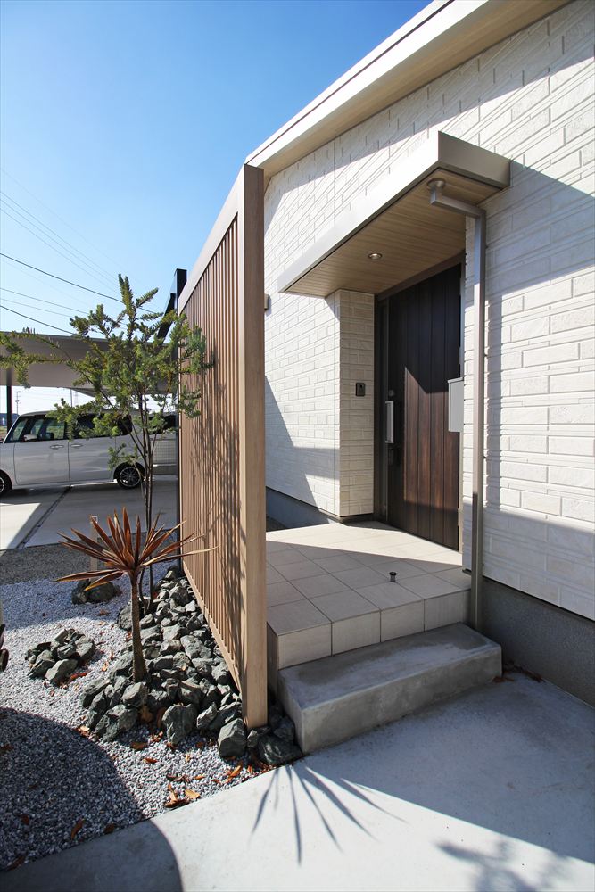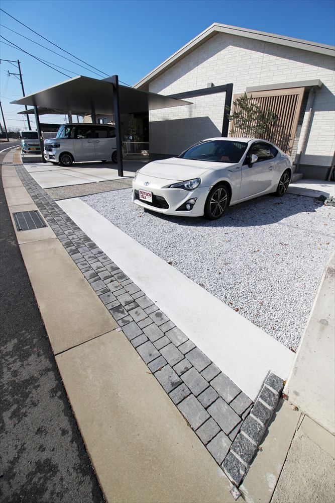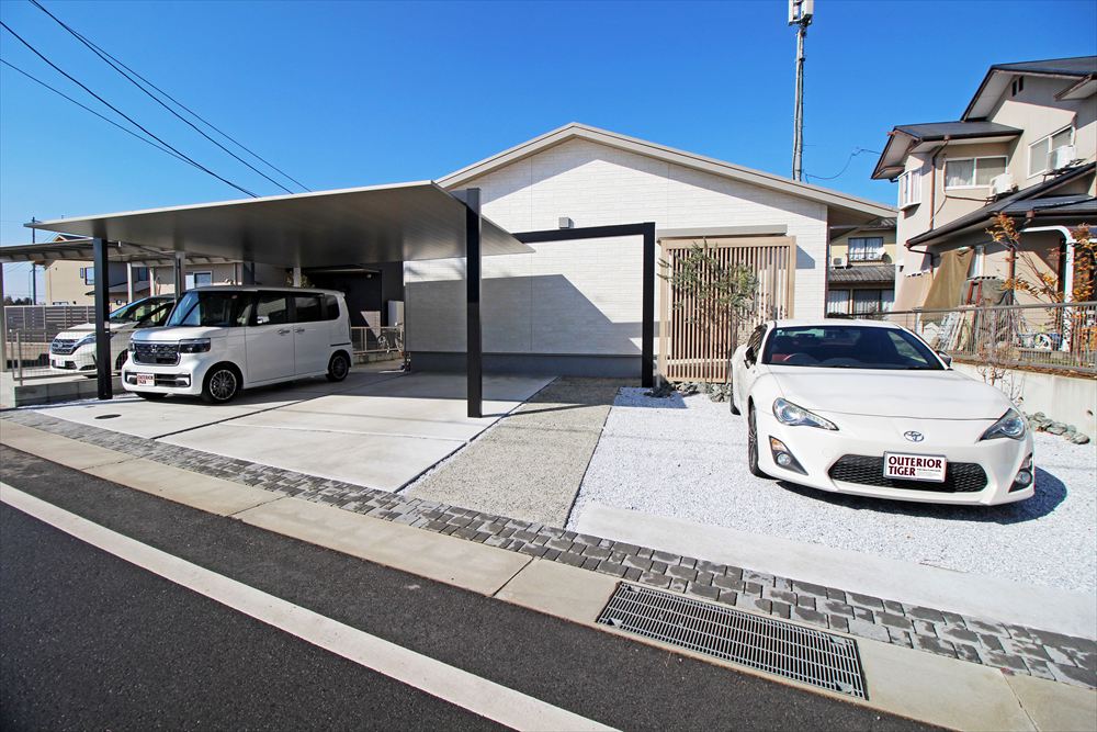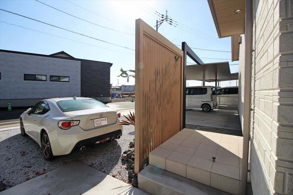 ”かっこいいカーポート”を希望された施主様。選ばれたのは『LIXIL:カーポートSC』です。カーポートは玄関と対象の位置に配し、すらりと伸びるフレームと格子材で玄関へと誘います。ゆったりとしたゾーニングで広い間口を有効に活かしたファサードです。