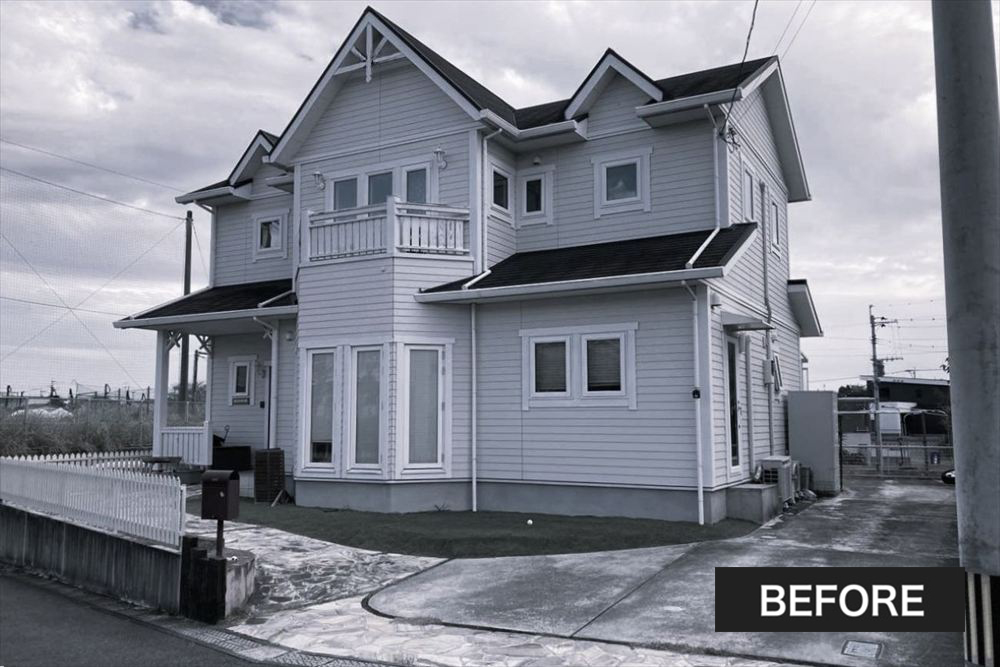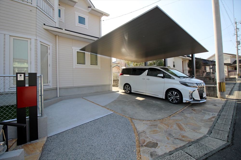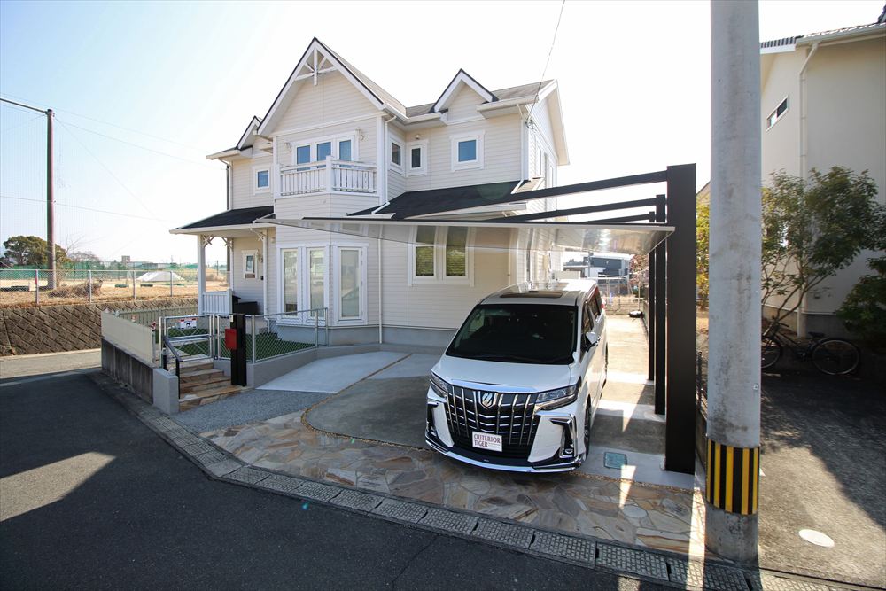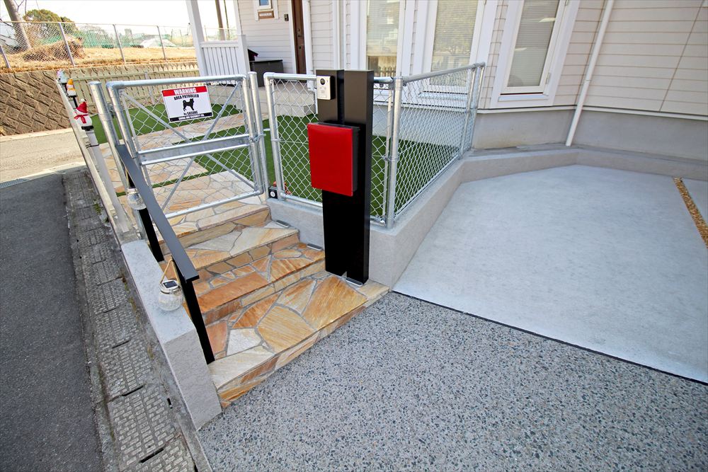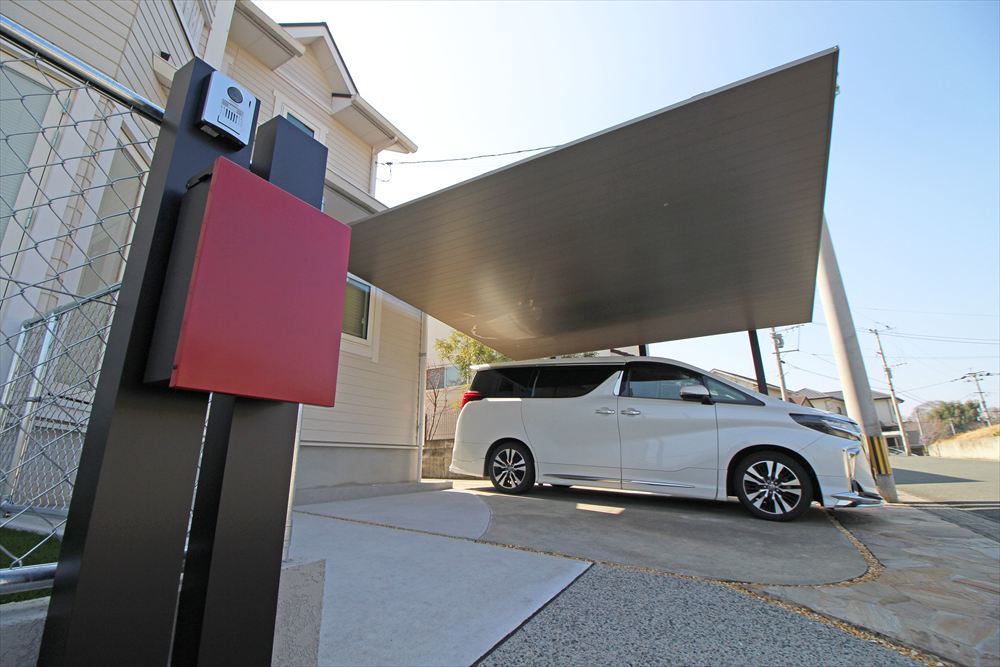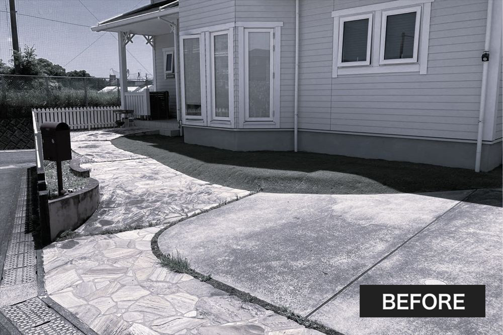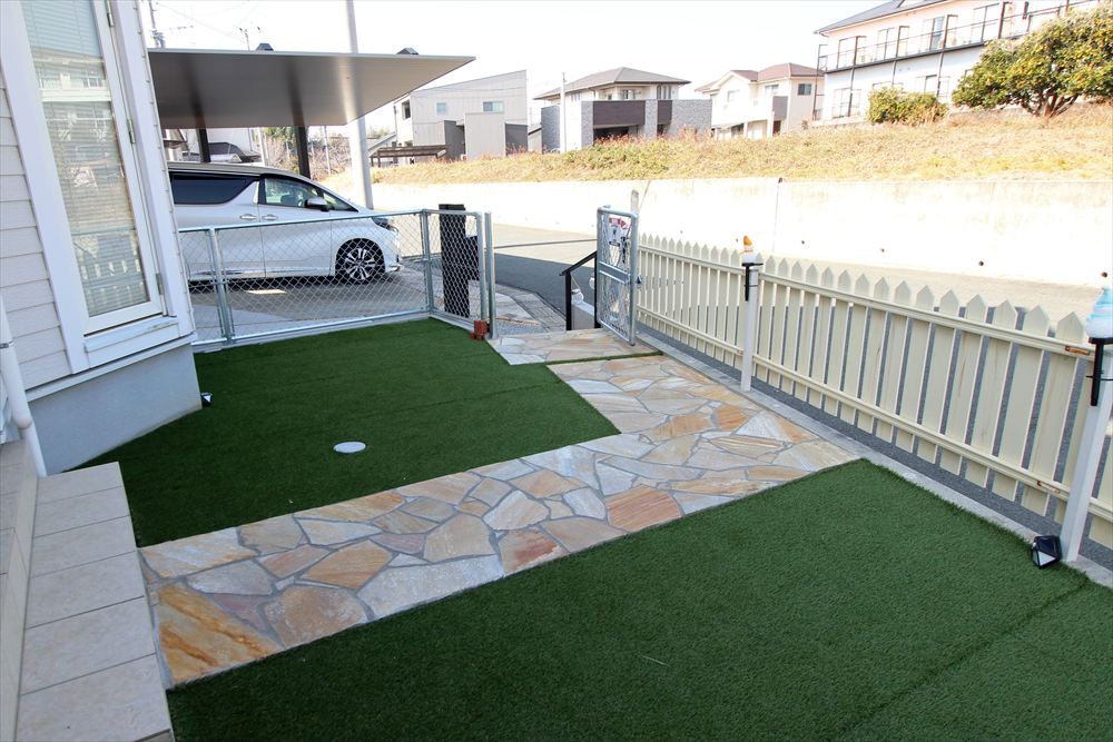 新設したカーポートは車の出し入れを考慮した後方支持タイプの『LIXIL:カーポートSC』。芝の法面を無くして土間スペースを拡張し、ゆったりとした駐車が可能になりました。ワンちゃんが遊べるように玄関前を囲み、新たに施工した人工芝の緑が優しく広がるファサード。ご主人こだわりのPCフェンスの門廻りで外観のイメージを一新しました。