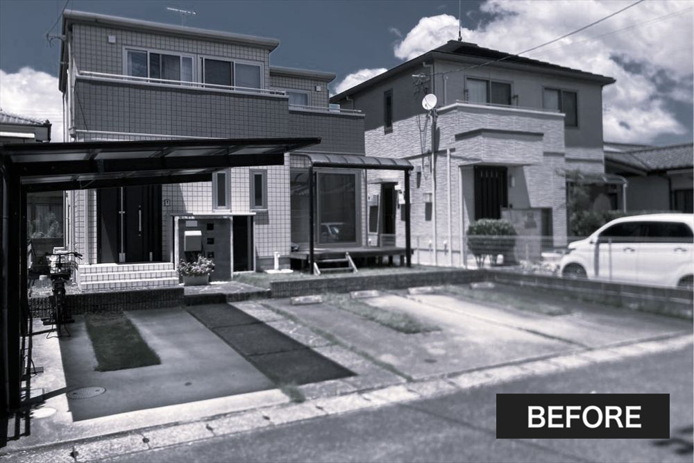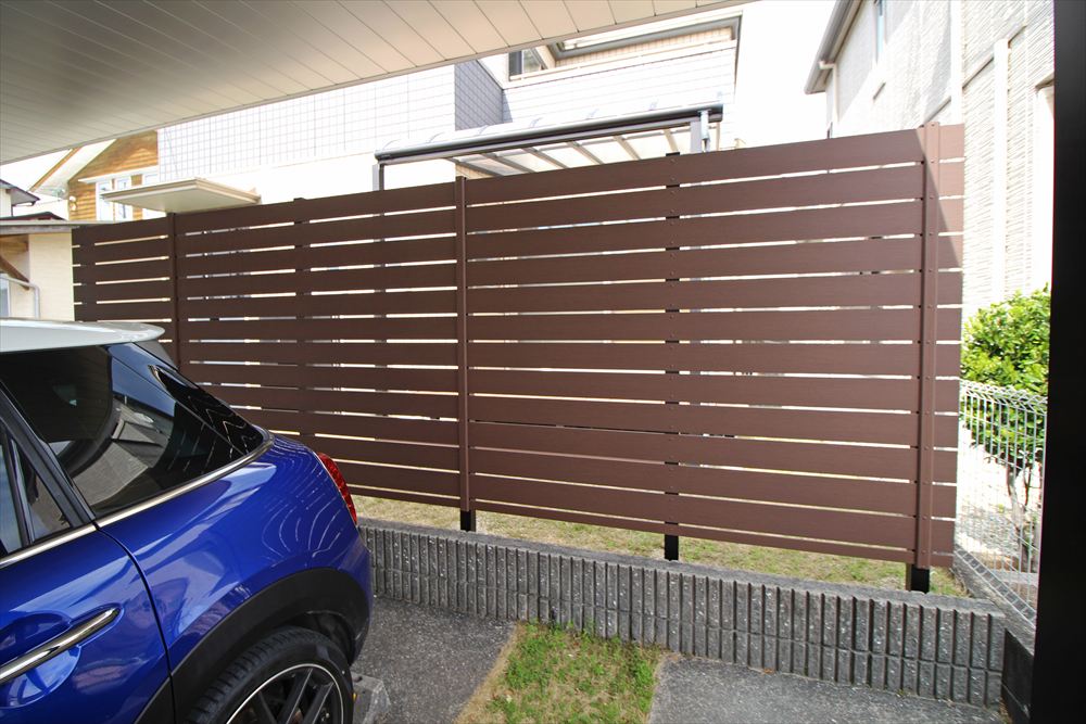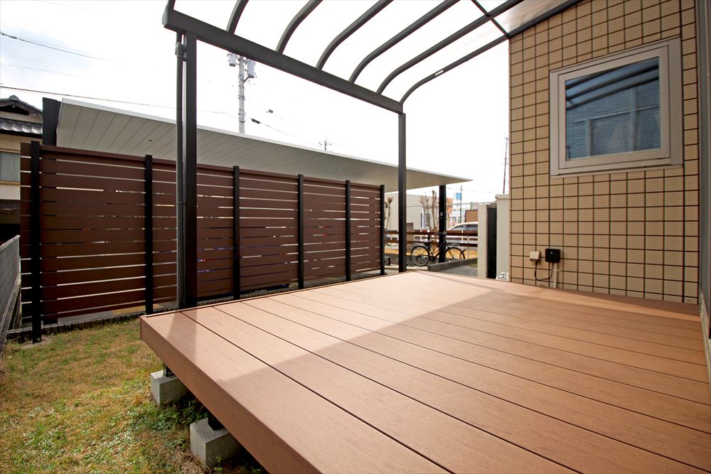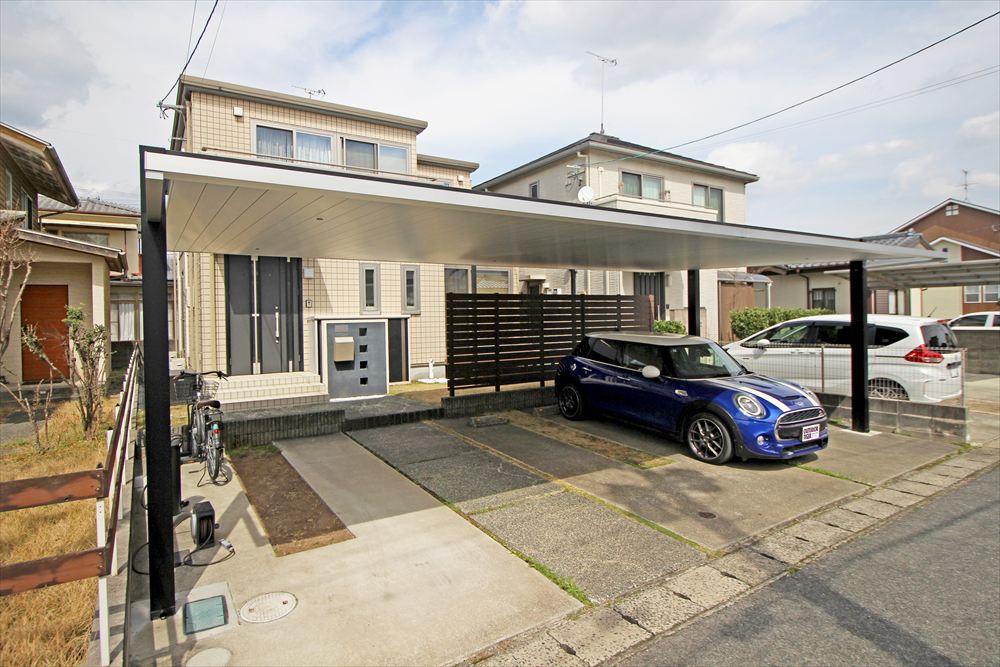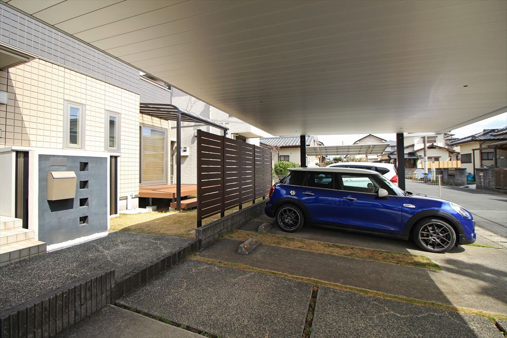 広い車庫スペースを悠々と覆うフラット屋根のカーポート『三協アルミ:FⅡ』。スマートなフォルムと鮮やかなツートンカラーが外観に調和します。リビング前には人工木デッキが広がり、目隠しフェンスでプライバシーを確保しました。