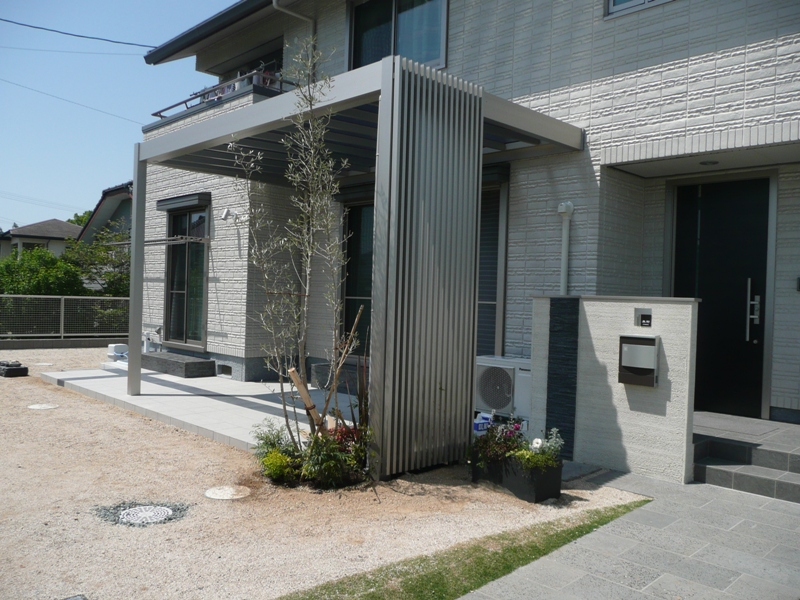 リビング前の日除け、アプローチ・駐車場からの目隠し、及び雑草対策でご相談を受けました。建物が大きくお庭が広いため、高級感のあるリレーリアテラスをご提案しました。熱線遮断効果の高い屋根材と玄関側に目隠しとなるスクリーンを設置。広めのタイルデッキで土スペースを減らし、雑草対策になっています。