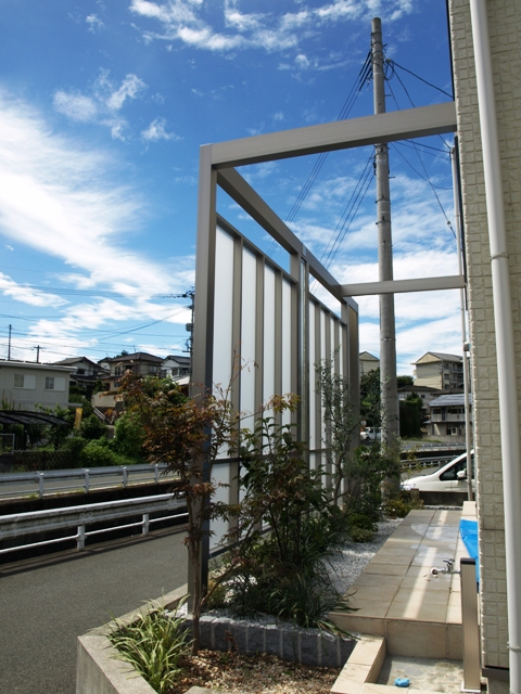 をご提案しました。シンプルな雰囲気の建物に合せ、縦長スクリーンパネルを使用し、明るさも確保しつつ、道路からの目隠しが完成しました。お気に入りのインゴット200も取り入れ、夜も見て楽しんで頂けています。ガラスが入ると植栽も活きます!!