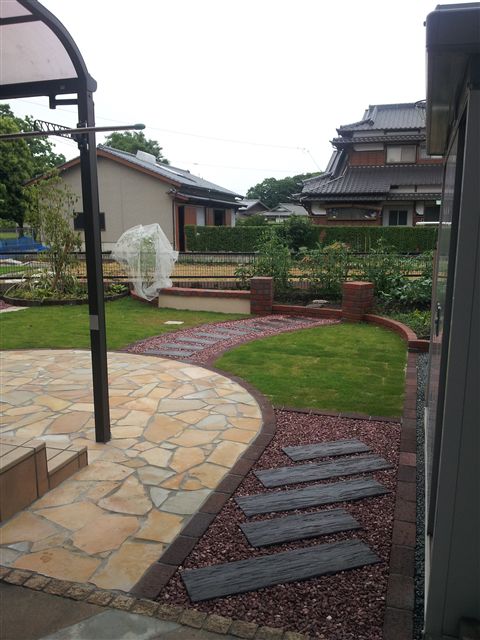 芝生のお庭をリフォームしました。既存のテラスとアプローチをつなぐ石畳風の通路がポイントです。自然石やレンガなどを用いた既存のアプローチなどとの調和を考えて素材や色を選びました。