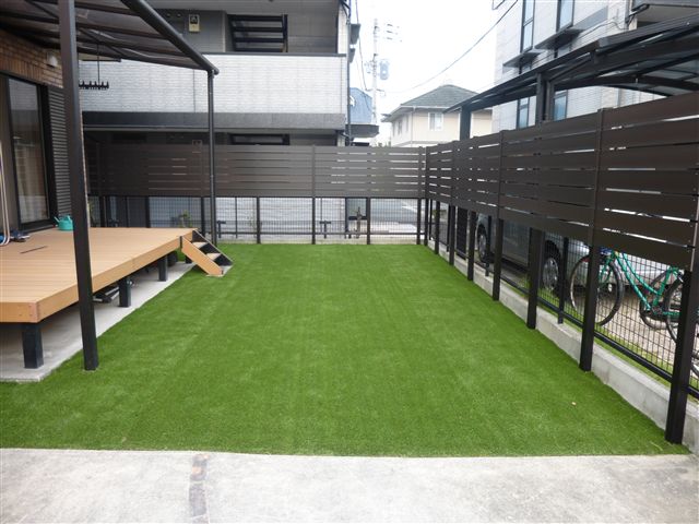 以前のお庭はほとんどが土で覆われていたため、雨が降るたびに水がたまるとお困りでした。また、お子様がお庭でリフティングをするとのことでしたので、人工芝をご提案しました。さらに、アパートや隣家の車庫に囲まれているので、目隠しのために高さのあるフェンスを設置しました。