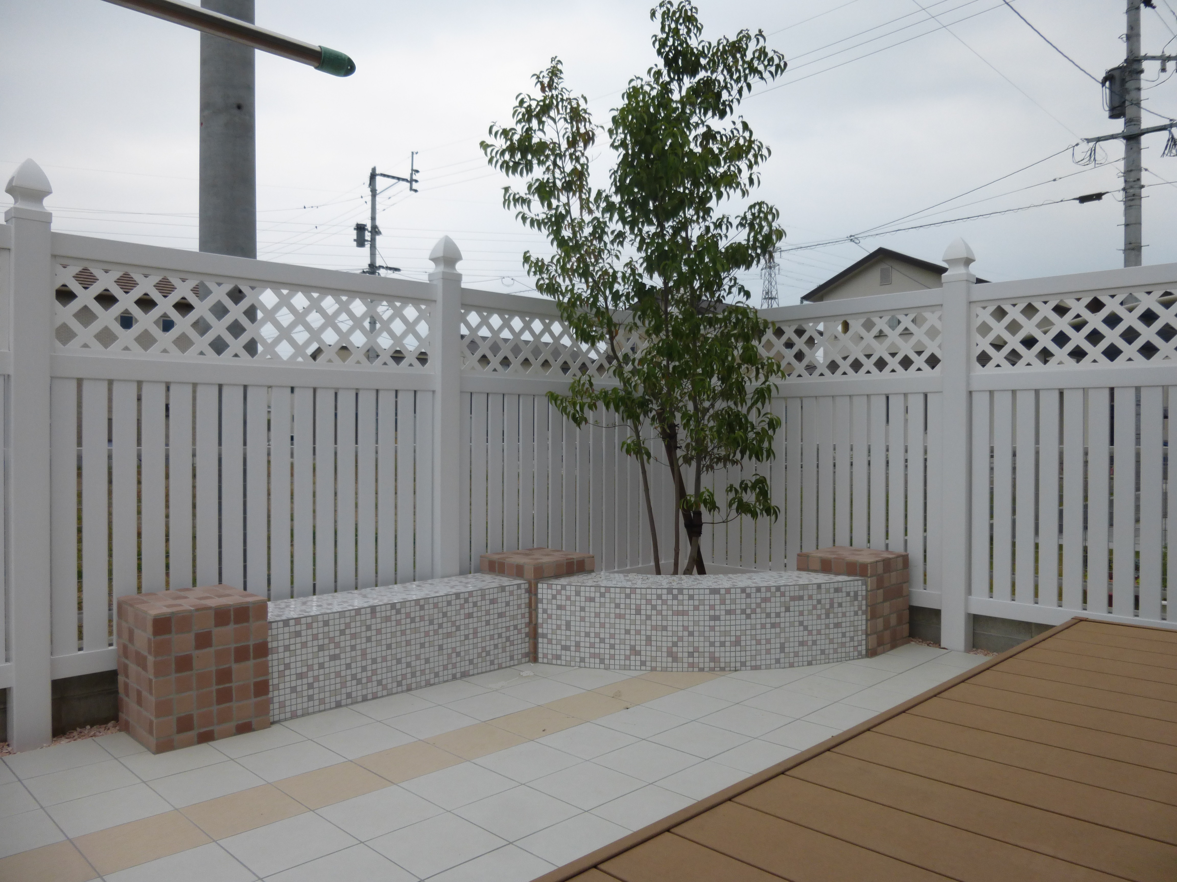 建物にあわせて、お庭もホワイトを基調にご提案させて頂きました。目隠しにはメンテナンスフリーでエレガントなタカショー『ロイヤルフェンス』を使用しております。コーナースペースに花台・ベンチを設け、シンボルツリーにヤマボウシを植えております。人が集う空間になったと喜んで頂きました。担当:アウトテリアプロデューサー新堀 徹