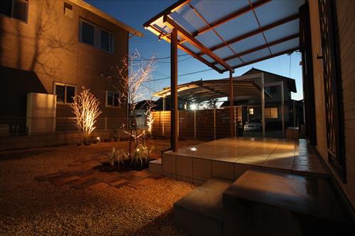新築外構からお世話になっているK様より、お庭の雑草対策のご相談を頂きました。初めはテラスと土間タイルテラスのみご希望されていましたが、お庭をより活用して頂くために「見る・使う」の双方からご提案。全面に敷き込んだカラー砂利にはクラシックレンガとローズ系の乱形石をアクセントに入れ、木調のテラスを設置してナチュラルな雰囲気に仕上げました。ポイントで配した樹木の足元には照明を設置し、夜のライトアップでお庭全体が優しい光に包まれ、心に癒しをお届けします。公園のようなお庭をとても気に入って頂き、毎晩眺めていらっしゃるそうです。担当:アウトテリアプロデューサー 蛯原 久智