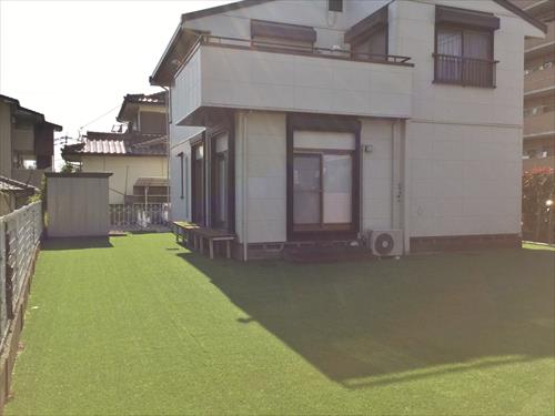「雑草や木々に覆われた広庭をどうにかしたい」という事で、広いお庭がお子様が遊べる空間になるよう、全面人工芝を張るご提案をしました。人工芝"ネオグリーン"は、踏まれても元に戻る"超復元力"が特徴。質感にもこだわっているので裸足になるとまるで天然芝のような感覚を覚えます。防草シートで雑草対策も施しています。お隣との目隠しに人工木フェンスを設置したので、プライベートな空間が確保できました。担当:アウトテリアプロデューサー 大江 誠