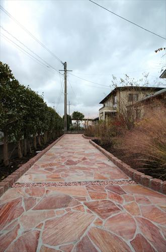 自然味あふれるN様のお庭には天然の芝が張られていましたが、お手入れが大変になってきたことからリフォーム工事を行ないました。樹木などはそのまま残したいとのご希望でしたので、既存の花壇部分はピンコロで縁取りし、土間には乱形の自然石を貼ってお手入れ要らずのお庭へ。地中には有孔菅を配しているので、雨水が溜まる心配もありません。