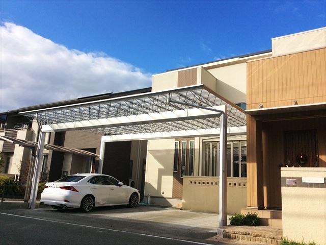 3台分のカーポートをご依頼のU様には、トラス構造が美しく印象的な 三協アルミ M.シェードをご提案致しました。1台大きなお車を入れるとのご要望、また車庫スペースがリビング前とのこともありましたので、出来るだけ光が入るようにと取付け高さも考えました。轍部分のみコンクリートで間は芝でしたが、乗り降りがしやすいようにコンクリート洗い出しにて仕上げました。「予想以上に良かった。」と出来栄えに大変喜んで頂けました。担当:アウトテリアプロデューサー 大江 誠