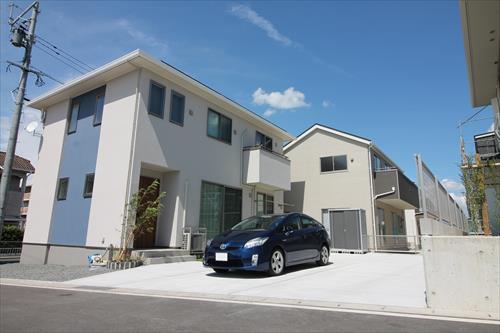 白を基調とした建物が映える、すっきりとしたファサードです。車庫のコンクリートにシンボルツリーのソヨゴや人工芝の緑のコントラストがとてもきれいです。広いコンクリートにはエキスパンタイトで目地を入れ、ひび割れを防ぎます。シンプルで無駄のないエクステリアとなりました。担当:アウトテリアプロデューサー 新堀 徹