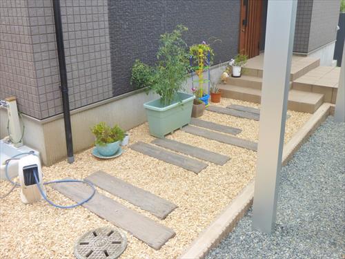 既存車庫の奥にさらに2台分の駐車スペースを設け、カーポートを設置しました。玄関からお庭に続くアプローチにはコンクリート製の枕木でアクセントに。お庭には人工木のデッキが設置され、お庭一面に防草処理を施し、砂利やタイルで見栄えよく仕上がっています。室内からの出入がしやすくなり、これまで以上にお庭が活用できると、喜んで頂きました。担当:アウトテリアプロデューサー 山本 圭介