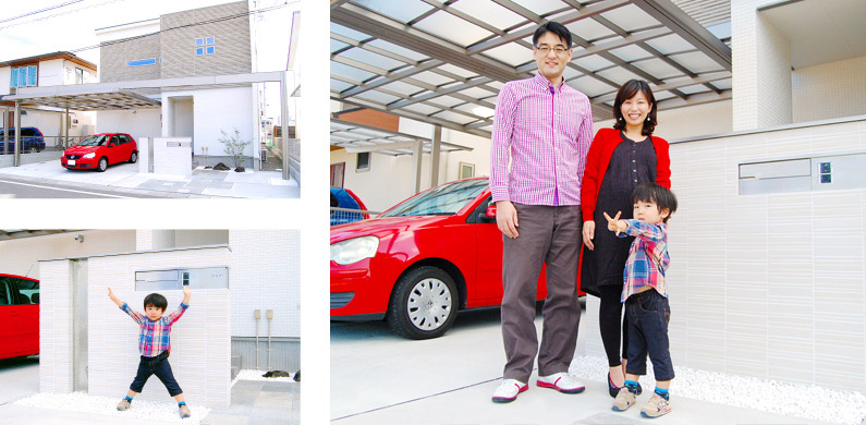 こうして始まった森様邸の外構工事は、「住まいに合ったカーポートをつくりたい」という要望のほか、「枯山水を取り入れたい」「庭先に洗濯干しのスペースが欲しい」など数項目に及び、その一つひとつにご夫婦のこだわりが感じられました。要望を形にするために綿密なやりとりを進めた担当者によると、「話し合いを重ねるたびに、ご夫婦の思いがひしひしと伝わってきて、それが原動力になった」と振り返ります。 第一の要望として挙がったカーポートは、柱の位置が鍵となりました。森様邸で採用したものは通常の規格とは異なり、柱がサイドに広がっているのが特長。そのため、車の出し入れがしやすく、同時に住まいのゲート的な役割も果たしており、まさに実用性とデザイン性を兼ね備えたもの。「息子がまだ小さいので、カーポートは絶対に必要だと感じていました。雨除けはもちろん、冬場には車のガラスの凍結防止にも役立つそうなので、今から楽しみです」とご主人。
